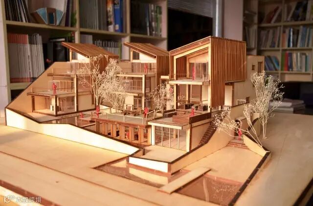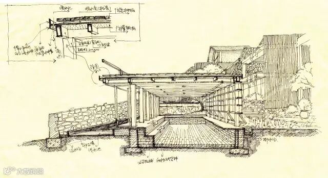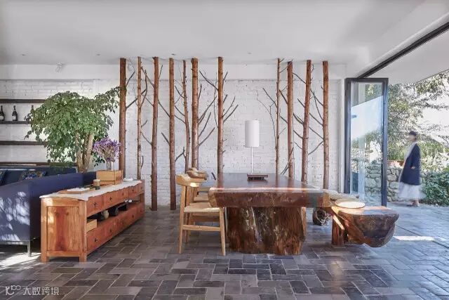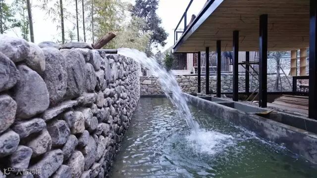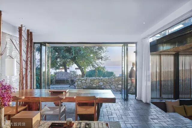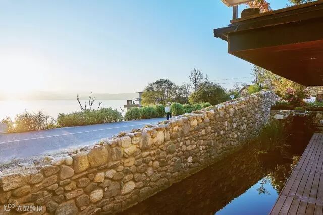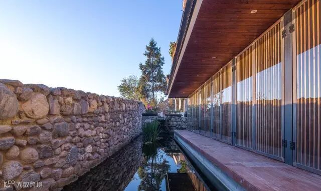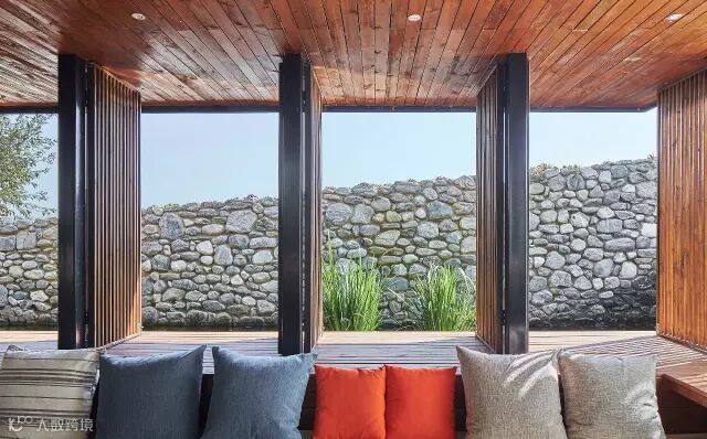 坡度平缓的石墙与建筑之间,则是一处灵动的水,它给予你一种平和的情绪,正如慢屋自己的表情。在下雨时更是与自挑檐落下的水形成迷蒙的风景,而你恰好可以坐在大厅书屋部分的木质平台上,从可开放式玻璃窗向外眺望,这是发呆的好时机。