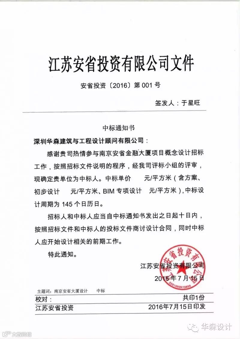 在江苏安省投资有限公司组织的“南京安省金融大厦项目”邀请投标中,经过激烈的竞争和业主评标委员会多轮评审,最终确定华森公司为中标单位。