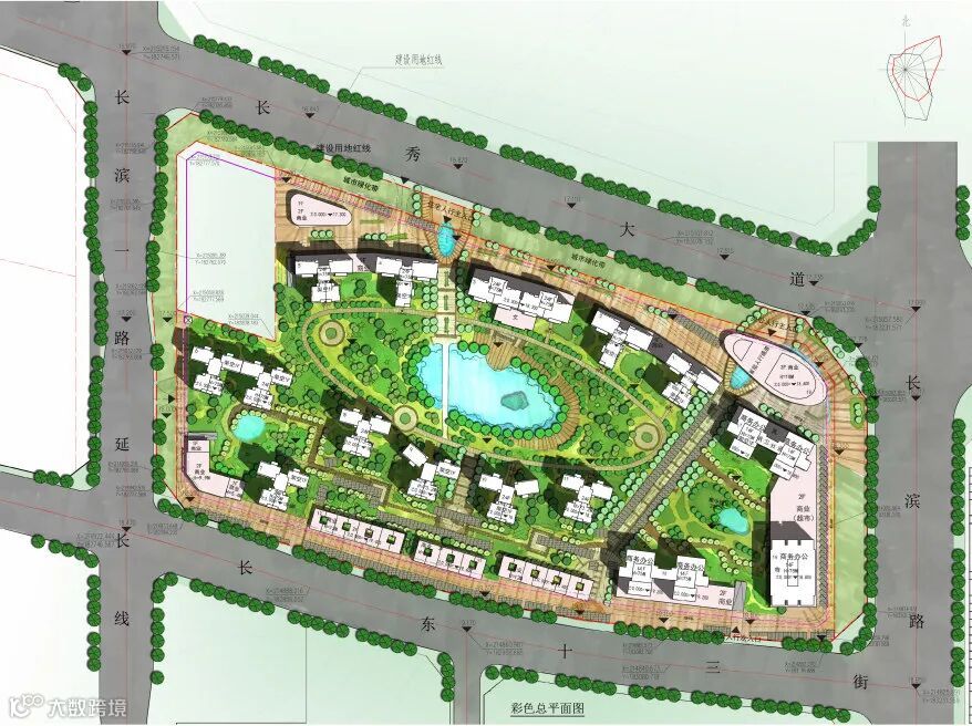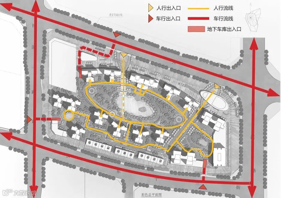 南侧沿长滨东十三街设置住宅小区主入口和住宅小区及商服公用出入口,北侧沿长秀大道设置住宅小区次入口及两处商服入口,西侧沿长滨一路延长线设置一个住宅小区人行口。既满足应设置两个或以上出入口要求的同时也符合城市主干路开设路口的相关要求。