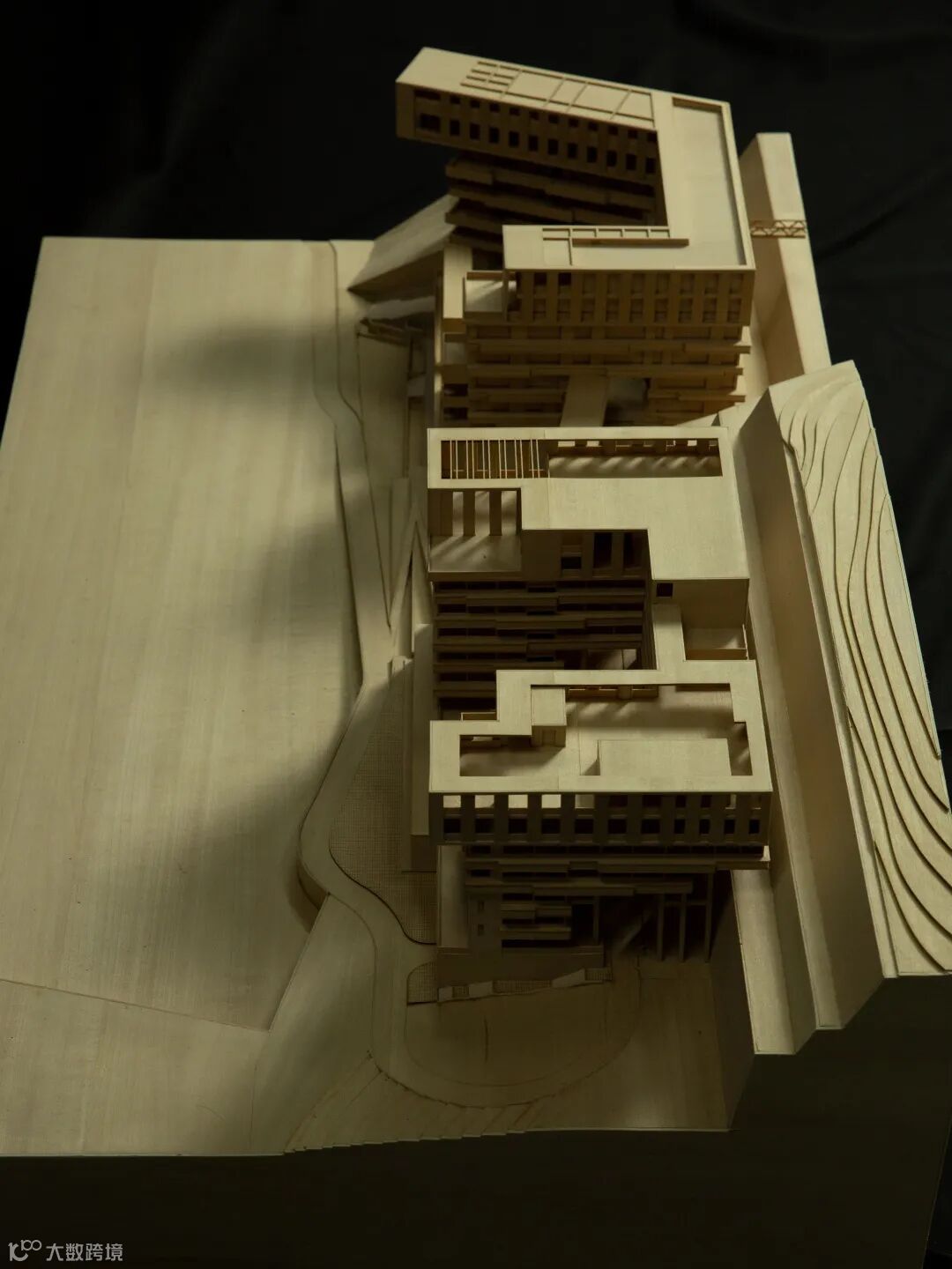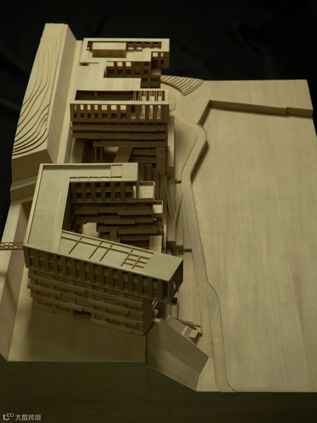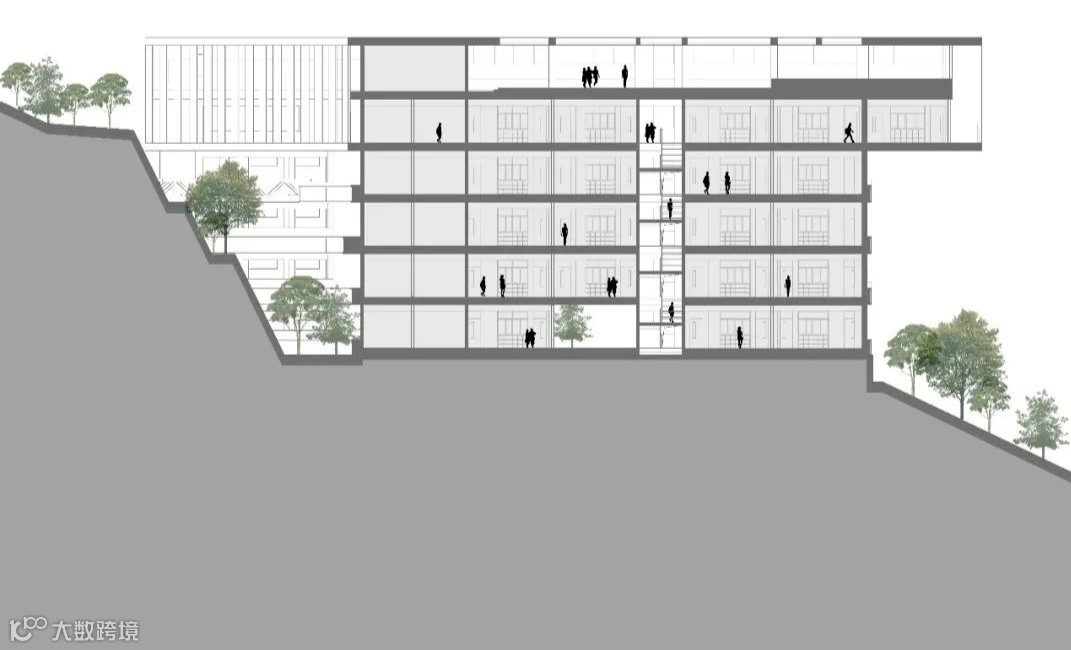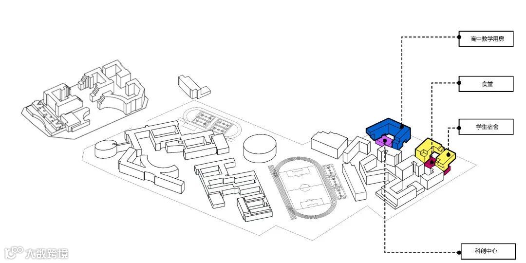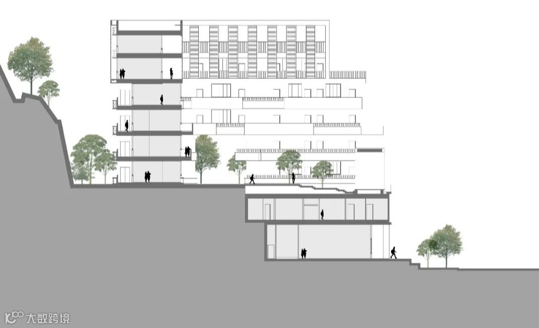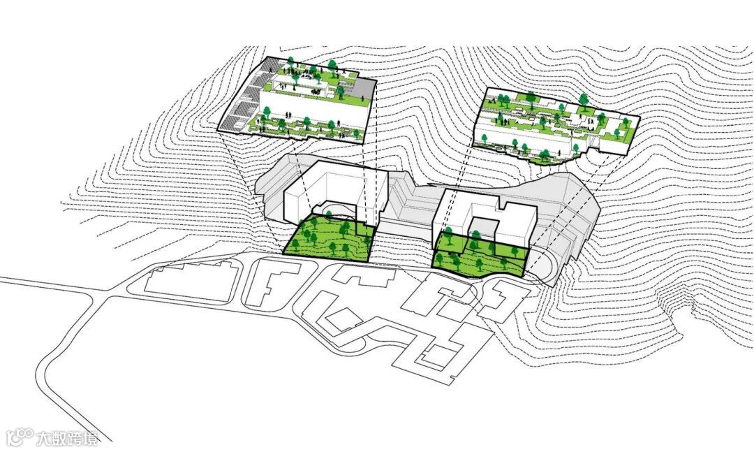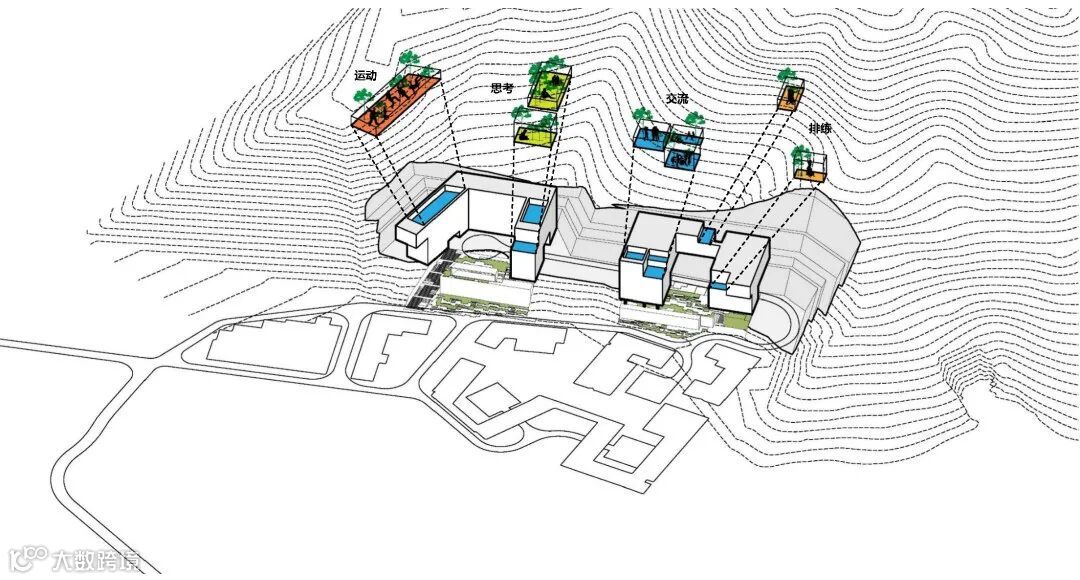 如果项目内的教学楼和宿舍的建筑体量直接从用地的低点升起,势必有一大半体量给埋在“山”里,基本的功能都满足不了,更别说架空层了。