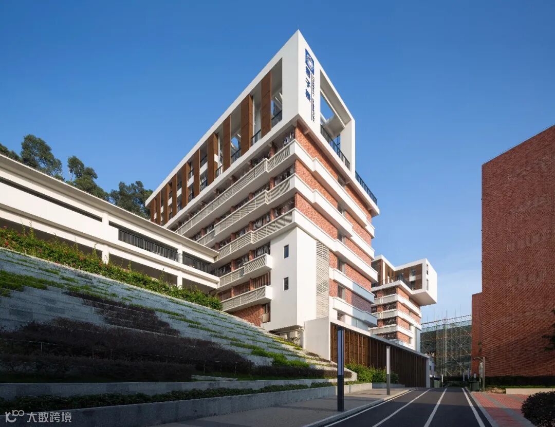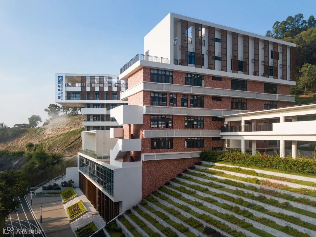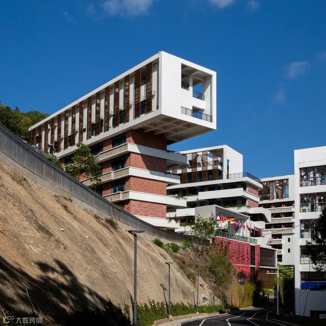 用地所在的平峦山脚,距西面的海边直线距离虽然有6公里,但由于建筑的整体抬升,和总平面的开口朝海的双U字型结构布局,使教学楼和宿舍顶上几层的视线可以越过西侧紧邻的三期宿舍,到达海湾。