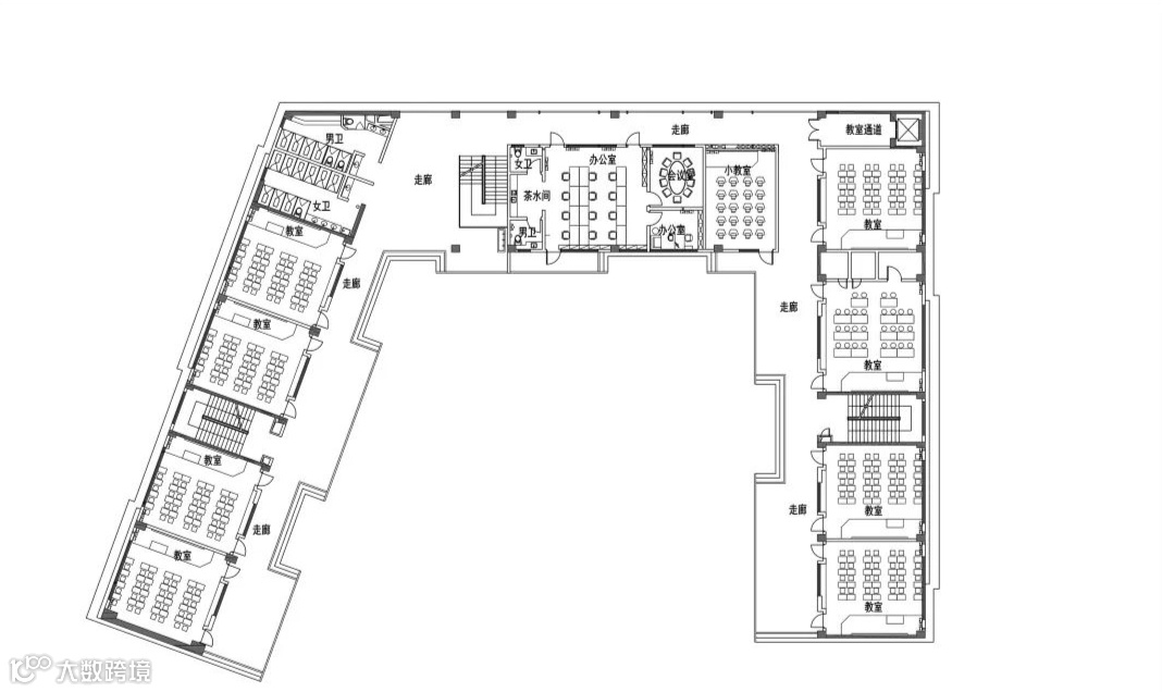 教学楼走廊的标准宽度为3米,并在此基础之上局部扩展到4.5米,上下错落布置,走廊外设花池,给同学和老师更多的活动和亲近自然的空间。