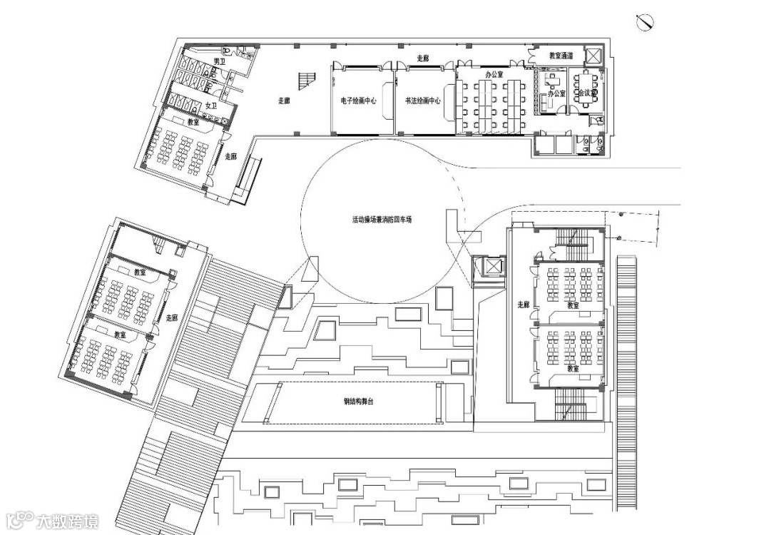 这样,建筑的体量被释放,并由此产生了开敞庭院、公共大台阶、表演舞台、架空层、退台、出挑等一系列不同标高但又自然连接、丰富多样的公共空间。