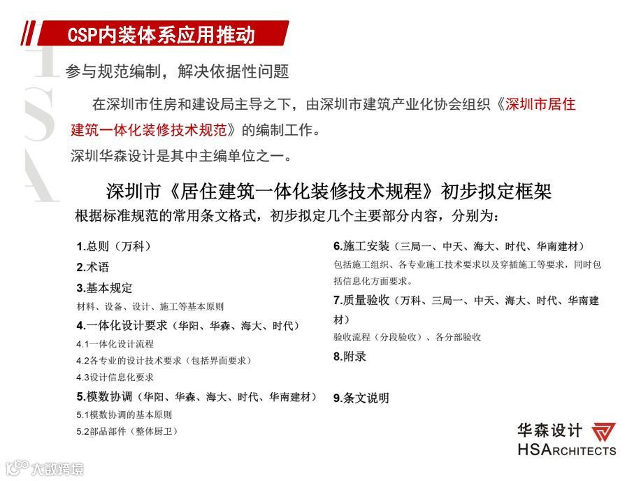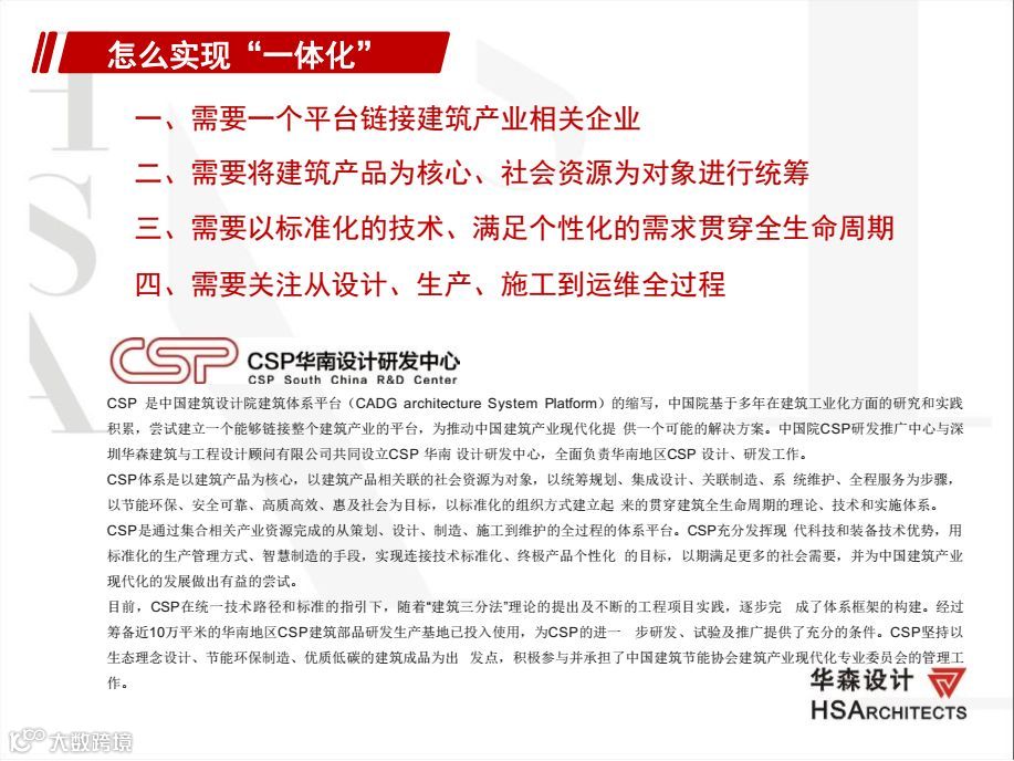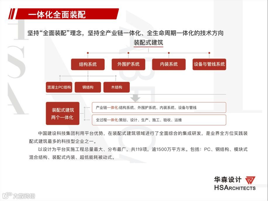 华森公司致力于装配式建筑领域的研究。去年依托中国建设科技集团4+1的平台模式获得了建设部颁发的第一批换牌后的国家装配式建筑产业化基地授牌,公司参与集团主编及参与装配式建筑相关的国家规范、规程图集达十多项,负责设计的装配式建筑面积超过500万平米。