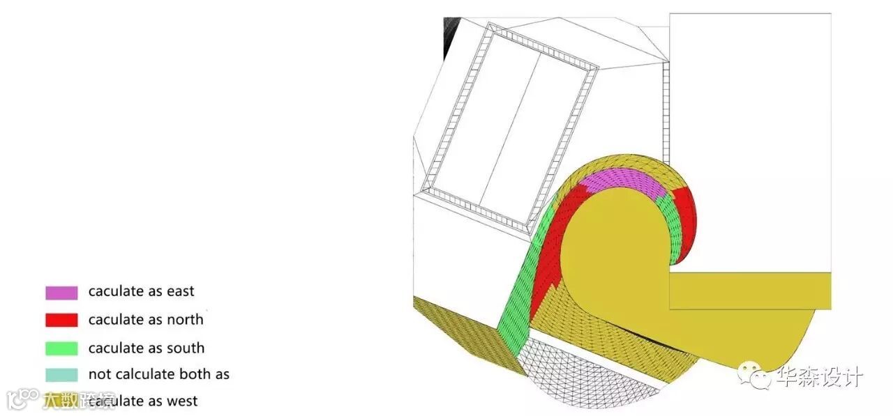 节能计算往往针对普通项目的墙体窗等进行分析决策,本项目曲面的复杂性在节能计算中很难认定,通过参数化对幕墙的空间三维定位,我们方便地定义了节能计算中对幕墙,墙体朝向的认定,利用这些幕墙三维空间坐标的投影找到所有幕墙的空间朝向。