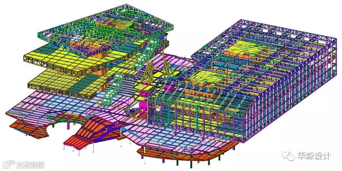 各个设计阶段的数据信息,通过BIM三维模型,精确完整地传递到下一阶段进行深化设计,甚至可以使用模型通过计算机直接提交给制造商加工异型钢构件而实现无纸化建造。BIM实现了形式与功能相结合的整体化空间设计。