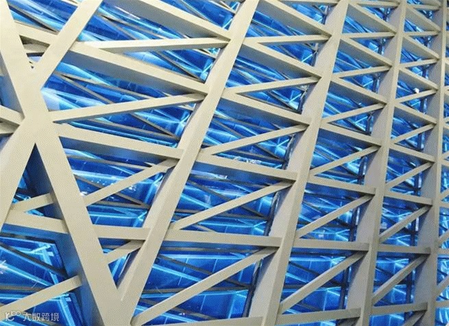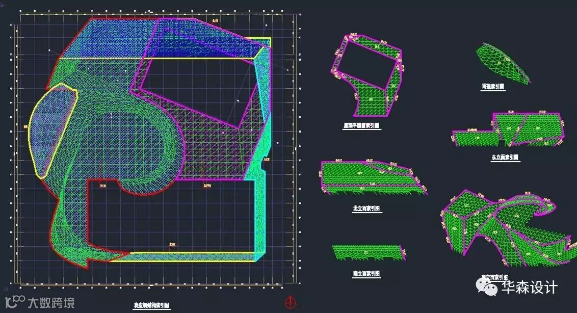 两馆项目外表皮为由倾斜、扭曲、旋转曲面以及部分直立面构成的复杂多面体网壳结构。