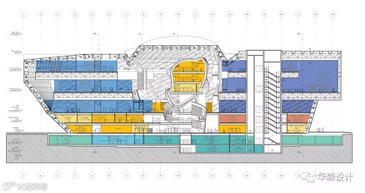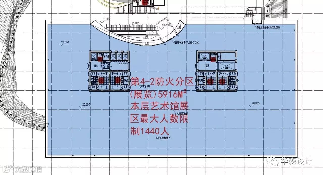 规划馆的矩形平面从10m标高层开始逐层扭转;并在两馆之间有一个大体量的峡谷形大空间,峡谷形大空间正中心设计了一个云雕塑造型,与峡谷形大空间一起形成一个连通的大空间。总建筑面积在15824平方米,因此根本无法采用传统分隔方式按规范所规定的防火面积将各使用楼层与峡谷形大空间进行分隔。