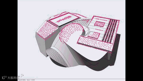 我们在设计中采用了粒子系统动力学来检测分析模型表皮防水结合部位的排水性能。这有利于帮助我们寻找到设置节水沟和雨水收集点的位置。