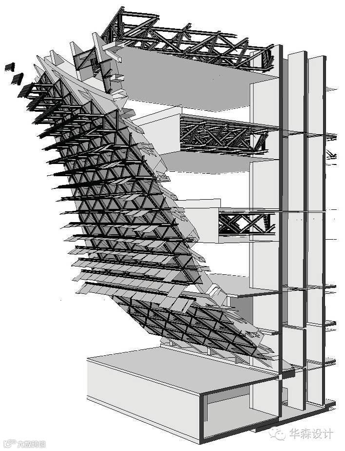 具体的结构形式为:在首层以下为钢筋混凝土框架-剪力墙结构体系,在首层以上分两大结构系统:表皮钢结构系统和塔楼范围的主体结构系统。