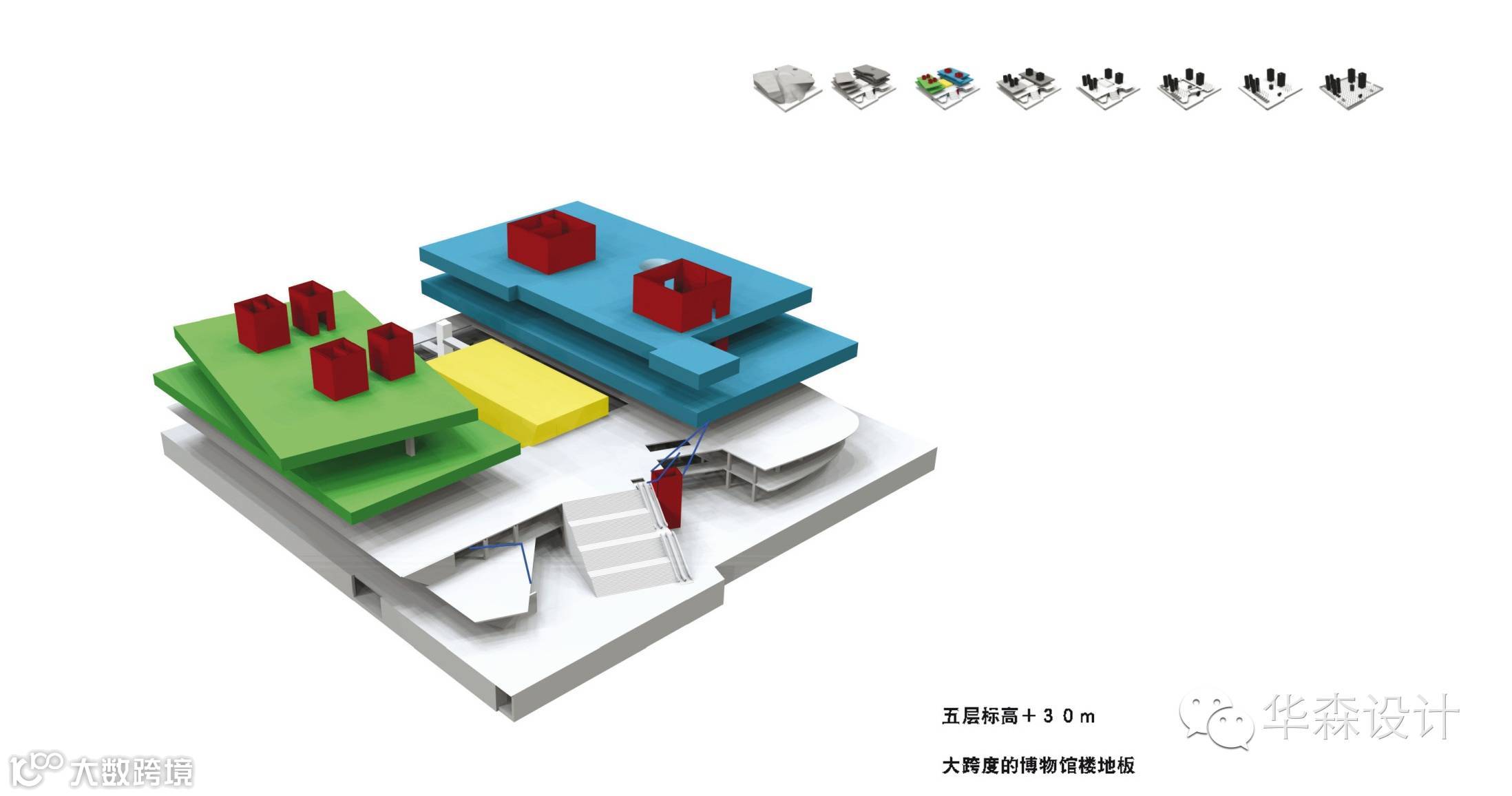 两馆项目的设计理念是一块半透明的城市巨石,富于动感的体型既符合中心区城市设计要求,也将建筑本身塑造成一个精美的当代艺术品。方案在10米高处设置了公共服务平台,开放的平台作为城市公共广场,为市民提供了交流与休闲的场所。平台中央26米高的巨型雕塑体既给展馆塑造了别样的艺术展品,又为两馆提供了横向的交通联系,合理组织了两个展馆的参观流线。