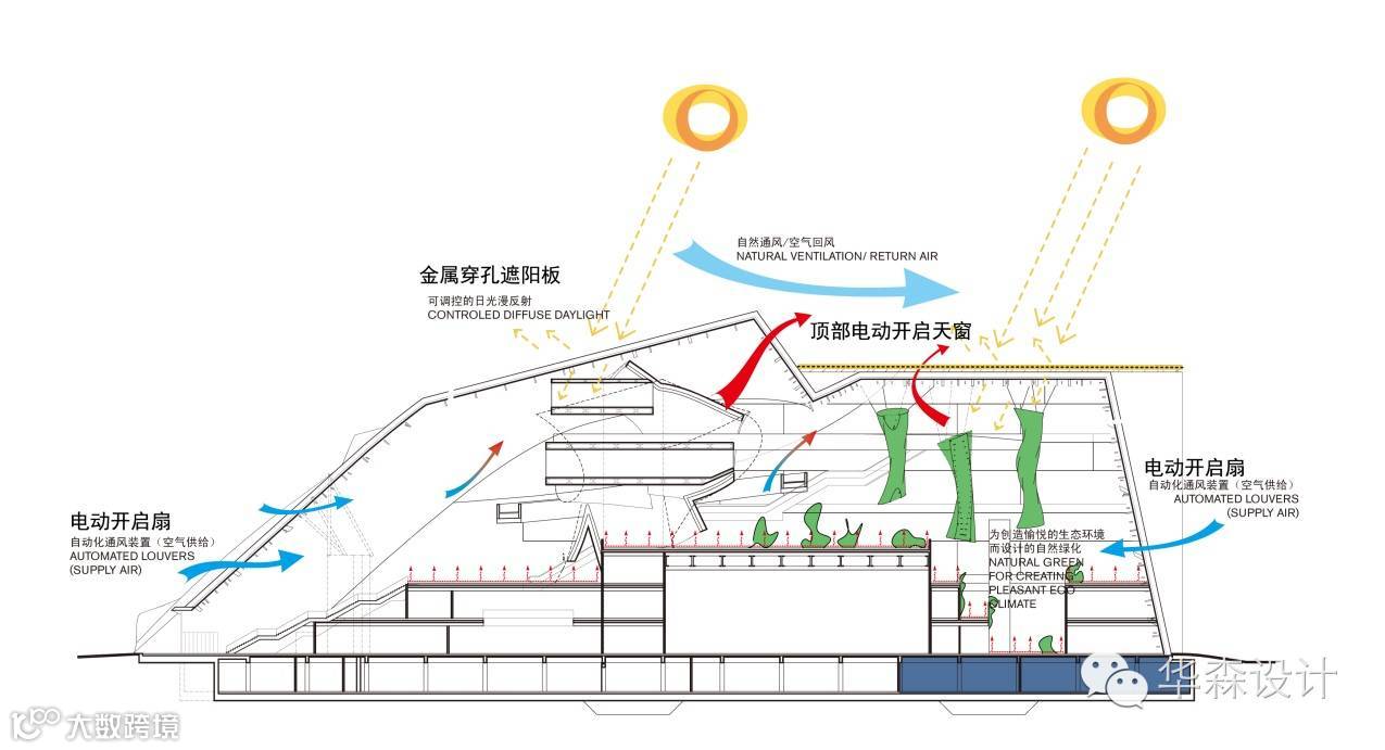 在公共空间和城市规划展览馆区域为了实现自然采光和通透视野采用了玻璃幕墙系统,在东、西立面是带穿孔遮阳系统的双层次玻璃幕墙系统;南、北面则以单层次的玻璃幕墙系统为主;屋面部分主要由直立锁边系统外衬金属板完成面构成、并在功能与建筑设计需要的位置辅以少量采光天窗。