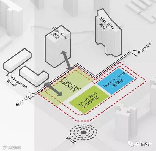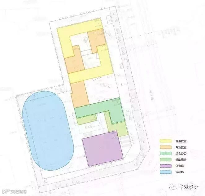 项目基地成L型,综合考虑各方因素,项目基地周边最大影响因素为东南角城市主干道十字路口,其次为基地西侧住宅区的高差问题。结合这两点,规划布局考虑教学建筑放置于靠东侧,利用跑道来退让西侧挡土墙,使建筑群保持较好的采光与视线;将体育馆建筑放置于东南角,以隔绝东南角十字路口带来的噪音影响。