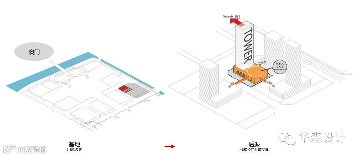 建筑塔楼部分尽可能向东布置,以最大限度的利用横琴港口和澳门的城市景观,同时在地块西侧退让出集中商业裙房空间,便于和周边地块商业形成联系的整体,整个大地块形成一个包围的商业空间和塔楼间良好的视觉避让。