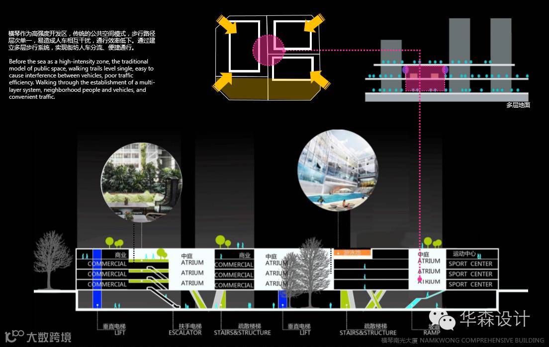 横琴作为高强度开发区,传统的公共空间模式,不行路径层次单一,易造成人车相互干扰,通行效率低下。通过建立多层步行系统,实现街坊人车分流、便捷通行。