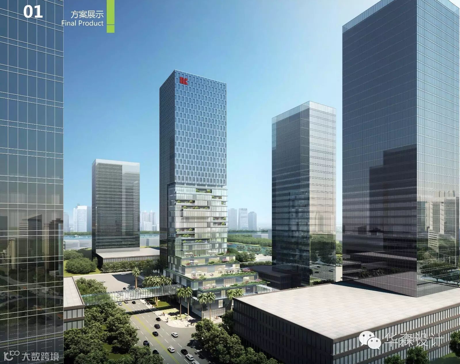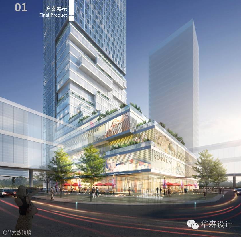 为创造个性鲜明的形象,将裙房顶部的绿化元素一直向塔楼衍伸,形成别具一格的商业形象的同时,也为塔楼办公部分带来了一些生态气息。