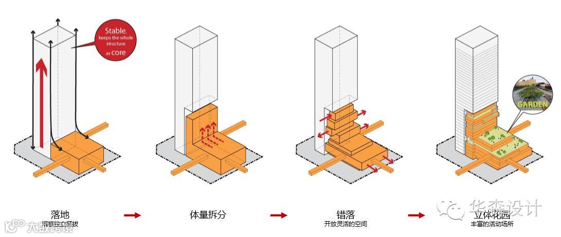 在成片的超高层塔楼中如何能够突出本项目的标志性,本方案采取的策略是在这边容积率密度高的口岸区域形成一个立体花园,朝向口岸人流的主要方向——环岛东路,让市民在远处就能看见一座绿色的“垂直森林”,吸引人流的进入。