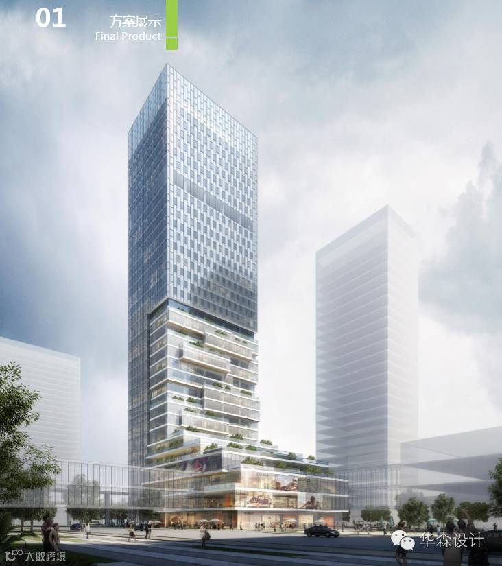 方案的设计,力图形成两个个性鲜明的形象。面向主干道及澳门一侧,整体设计显得非常完整,而面向地块内侧,整体设计表现得更加丰富、多元。商业裙房的体量自然地延续至塔楼,同时也将裙房顶部的绿化原色一直向塔楼衍伸,形成别具一格的商业形象的同时,也为塔楼办公部分带来了一些生态的气息。