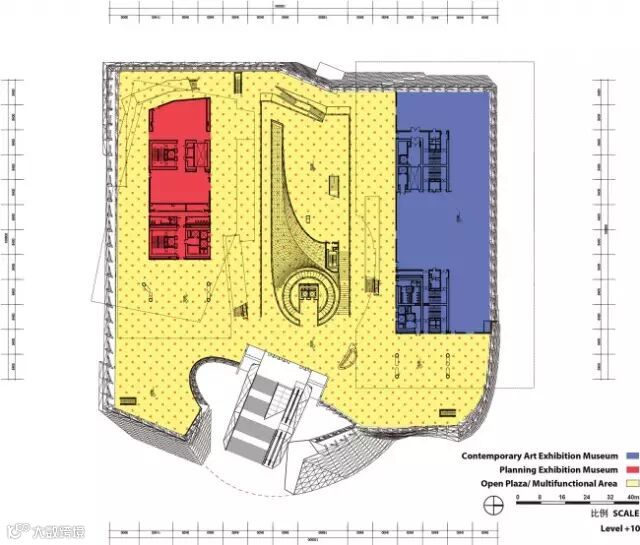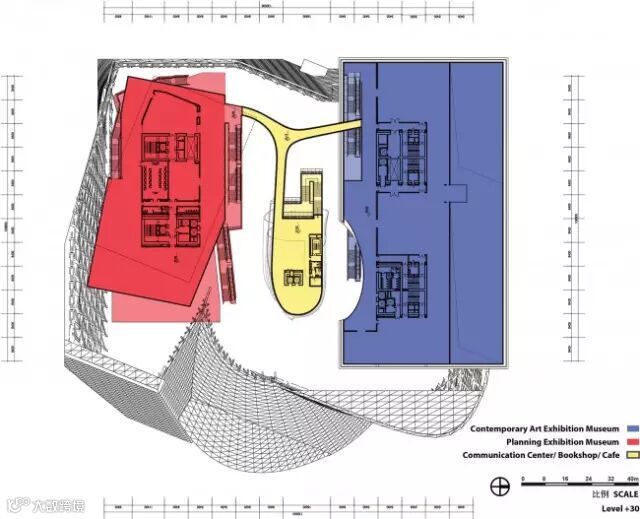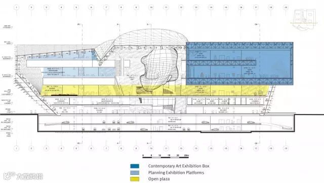 其实,只是看2层的平面布置图,基本是横平竖直造型的,下方粉色区域就是靠右侧的最大面积的展览厅,外形是个方盒子;上侧偏绿色区域就是那个2层的黑盒子,较小规模的展览厅。