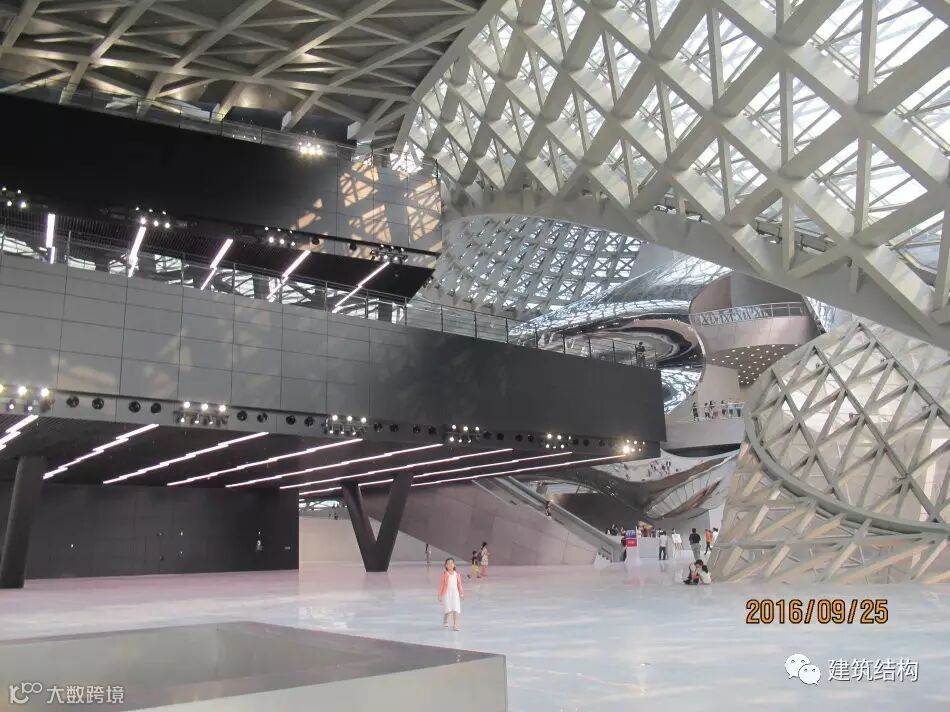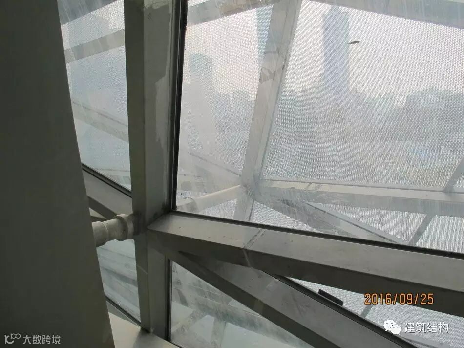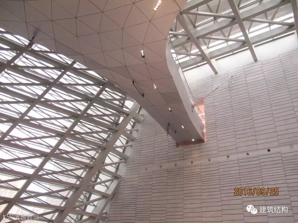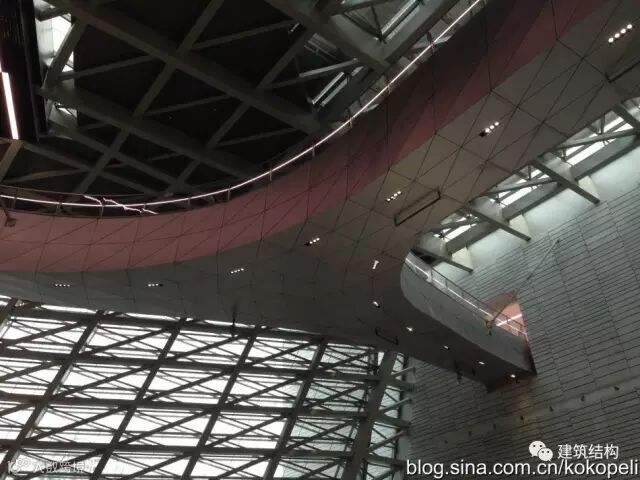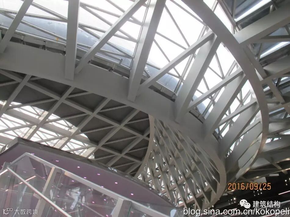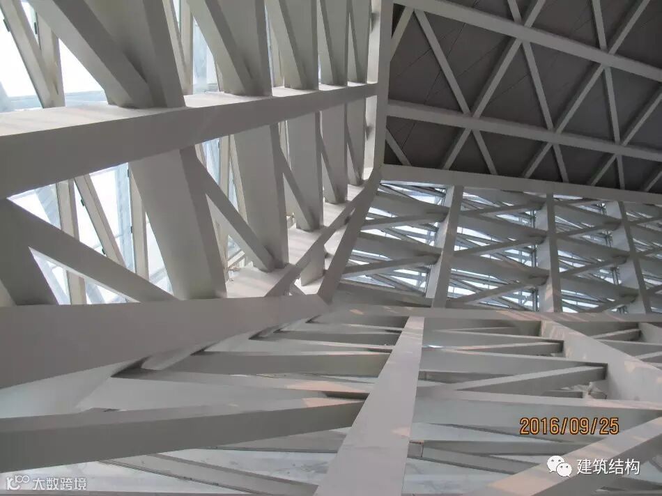 这个位置是外立面左侧呈现平行四边形的内景,为了抗住这个不稳定的结构体系,结构骨架通过巨大尺寸的方钢管和间距很密的斜撑共同组成一个空间受力体系,侧面和顶面形成一个整体,共同受力,顶面屋盖的钢构件承担了拉力,抵抗自重导致的外倾覆力矩。