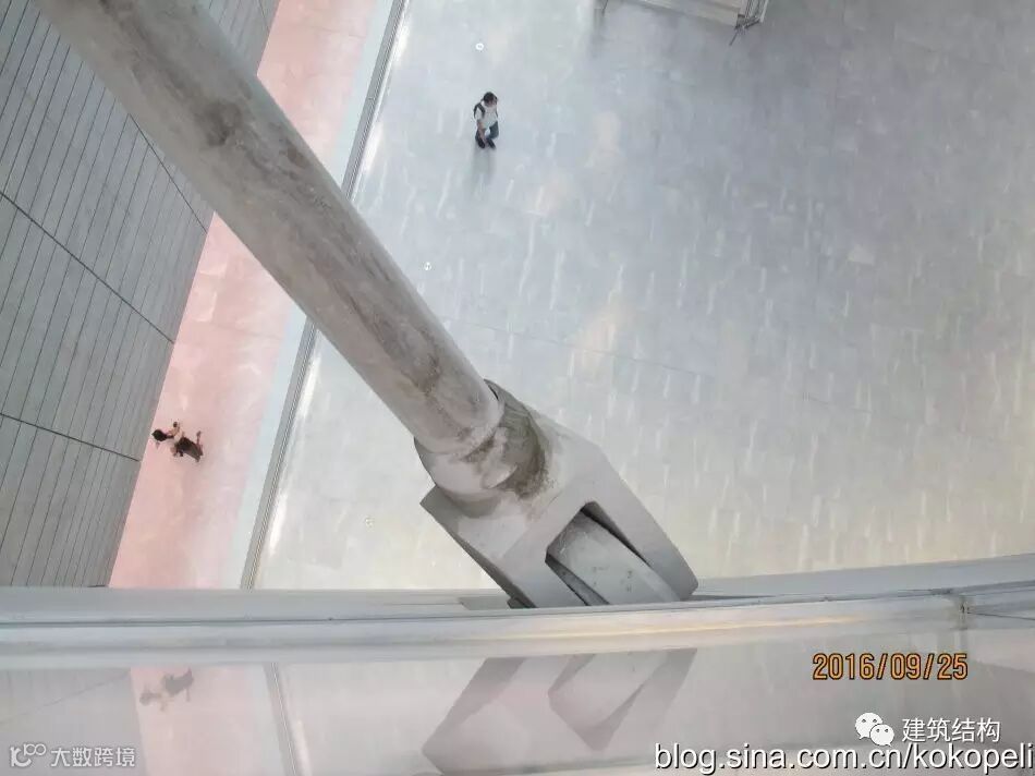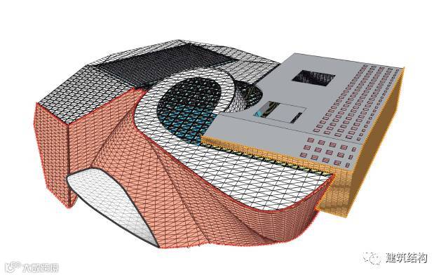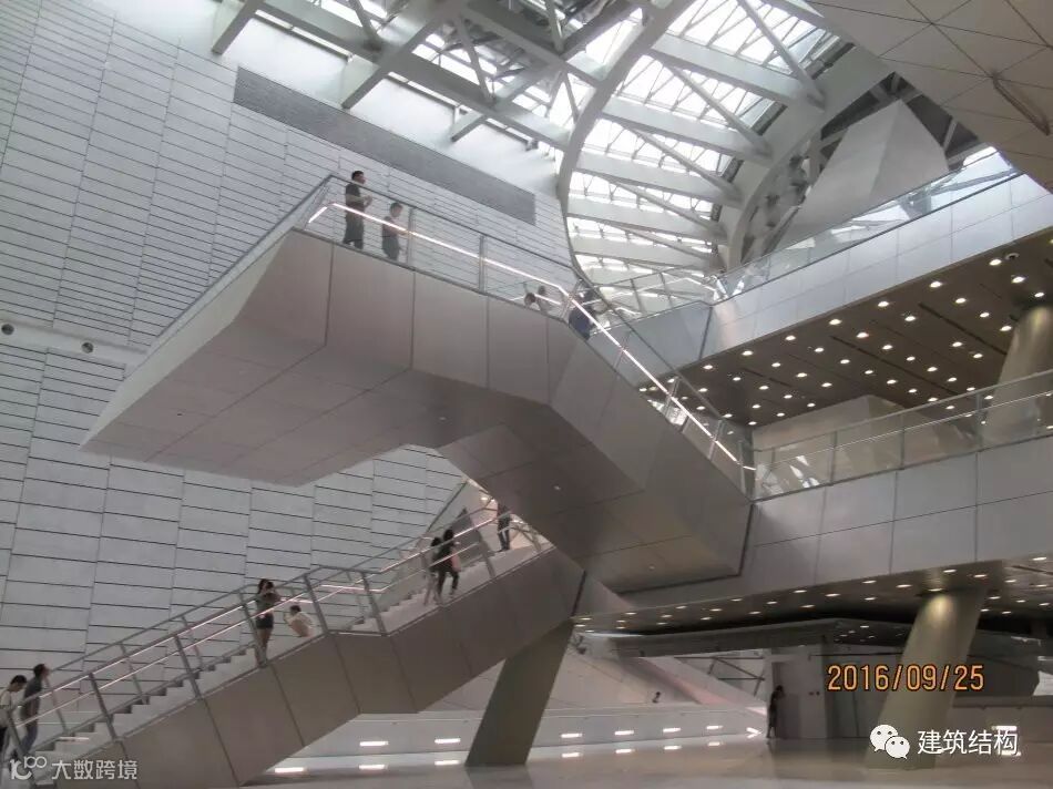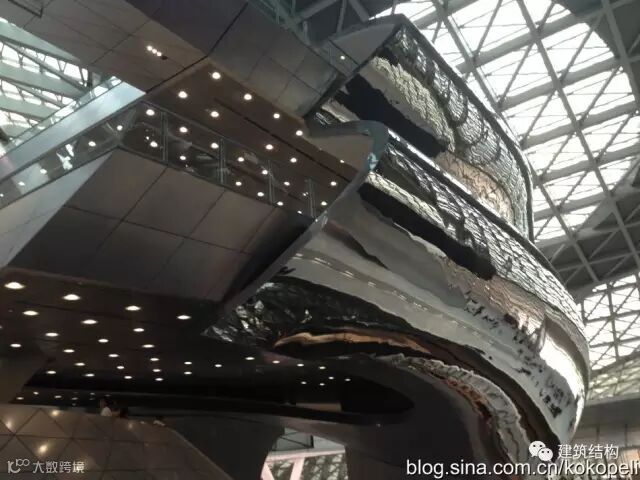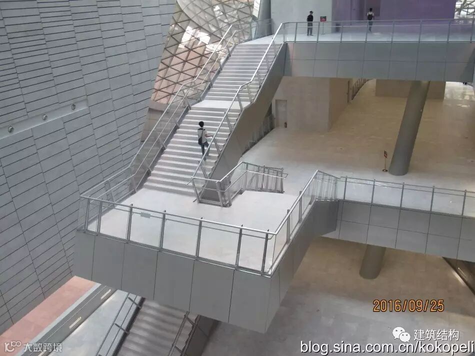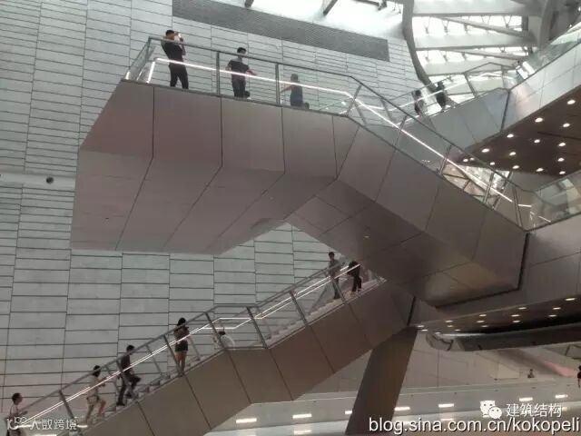 一切服务于造型的构件,连一个楼梯也是不惜代价,搞成空间结构,在常规休息平台位置不设梯柱,导致楼梯变成了一个空间受力体系,上半段梯板受拉、下半段梯板受压,连接位置的构造措施是否到位,决定了整个楼梯的安全性。