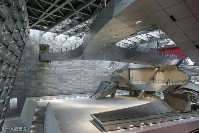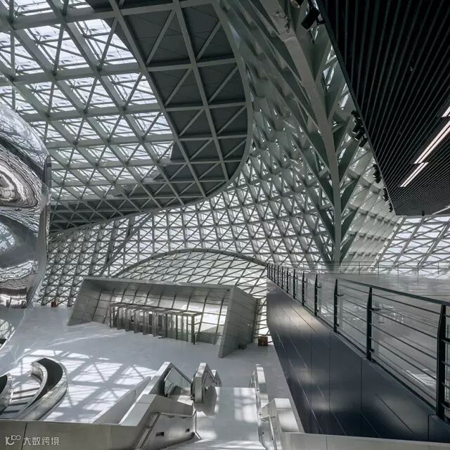 金属质感的流体占据了居中位置,左侧这个场景具有层次感造型的东西还需要好好消化一下才能理解。第一,左侧是入口大门的门字形的造型,上方配合延伸出去悬挑的拱形大门,中间顶部是屋盖结构体系,以矩形的方钢管作为主龙骨,配合对角线上的圆钢起到稳定性作用共同组成整体中心。第二,中间可以视为房中房的2个黑色的悬挑,完全独立于整个建筑物外壳。立柱采用了Y字形,估计也是和大悬挑平台配套的结构。特别是在颜色区分上有别于周边主体银灰色的外观。2层黑色盒子内是两个较大空间的展览厅,做到形式和内容的统一。第三,右侧就是居中的金属流体造型——“云”,估计不是搞艺术的人很难理解建筑师的创意。