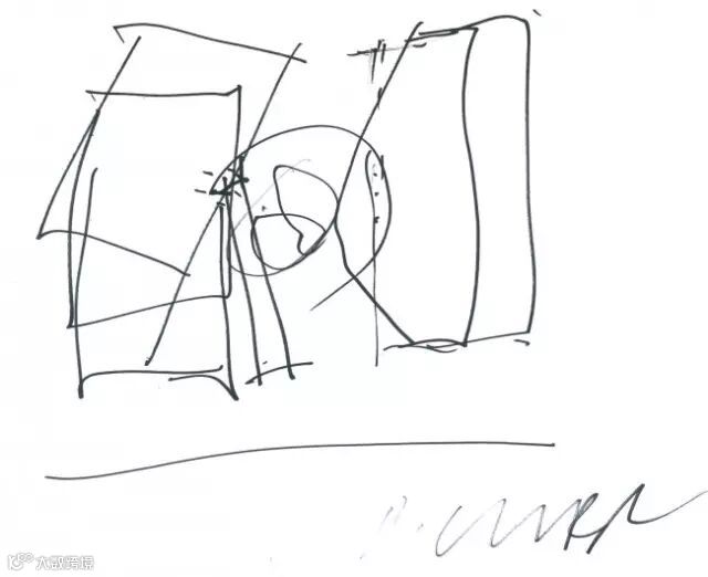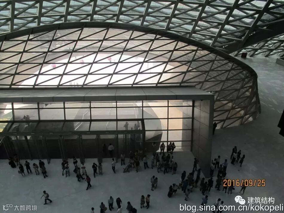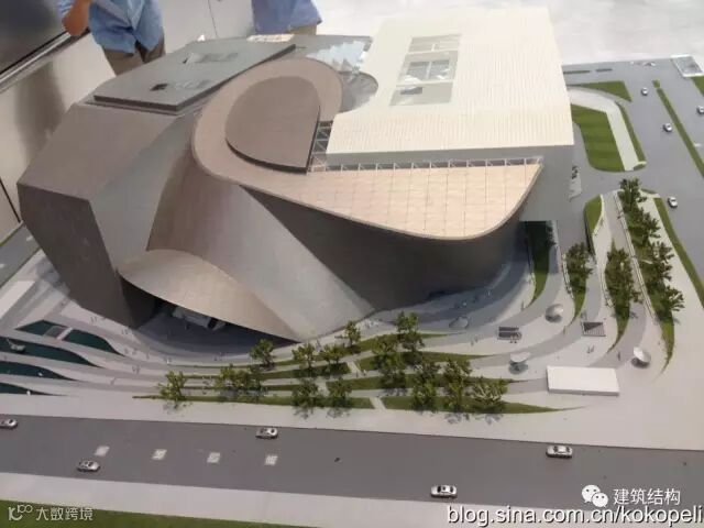 正立面左侧这个平行四边形造型确实不是一般房屋建筑常见的造型,众所周知,不是个稳定体系,却在这儿出现了,而这个造型实际上是组成这个整体建筑外形上像一个扭曲螺壳造型的重要组成部分,也是和右半部分像豆腐块的造型呼应对比,造成很强的视觉反差。作为结构工程师,最感兴趣的还是结构付出何种代价实现,这需要走到里面才能看到。
