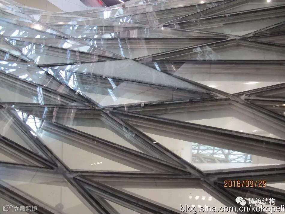 这是近景拍摄的室内玻璃幕墙,由于造型是曲面,能实现曲面最接近的就是三角形,但是无数个三角形由玻璃幕墙组成,实在勉为其难,其实接缝处的粗糙是不可避免的,算是个瑕疵吧。