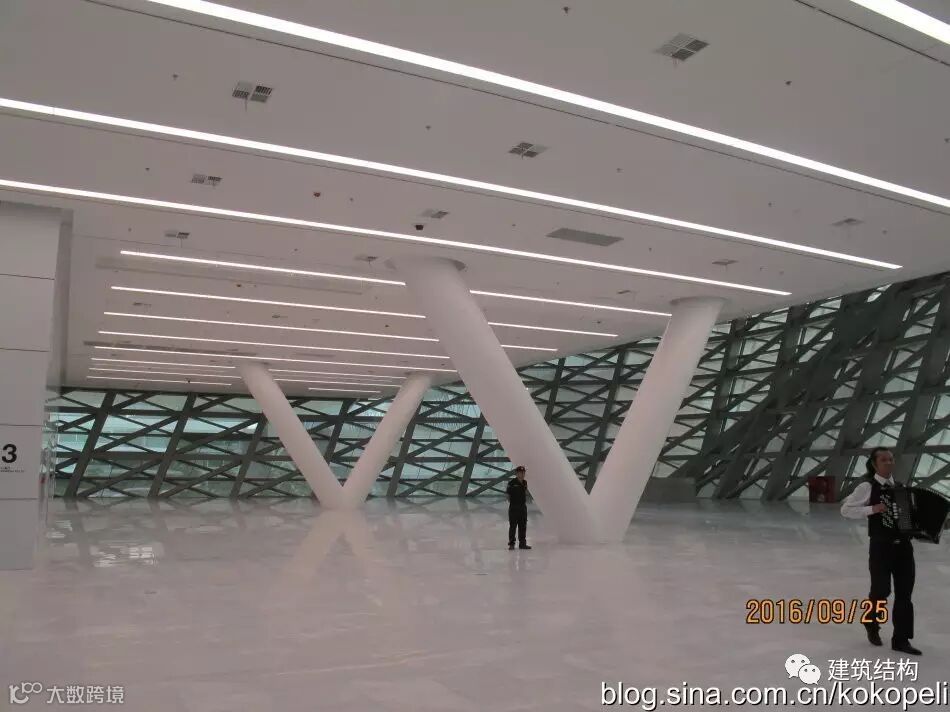 进门后右侧2个大V造型的圆钢管柱是支承上部楼层的唯一构件,如何保证整体结构的平衡性,是需要结构工程师好好琢磨的内容,起码是和左侧其他几个连为一体的。