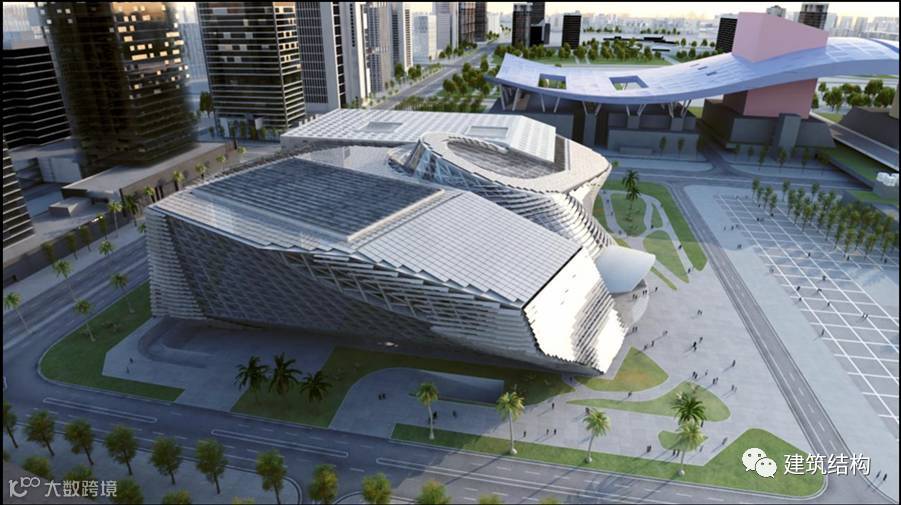 设计师描述深圳“两馆”项目的建筑方案亮点灵感来源:第一,用蝴蝶扇动翅膀的瞬间造型分别代表左右两个馆,也是外形的创意源泉;第二,大厅内不规则金属球叫“云”的造型来自于一颗围绕火星卫星的逆向自转的形态。该项目也是体型特别复杂的结构,包含空间倾斜面、扭曲面、旋转曲面和大悬挑结构,主楼和外表皮钢结构既相互独立又相互联系,空间关系复杂。