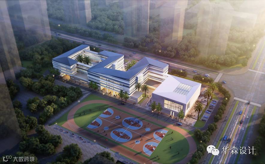 在一片现代住宅建筑群中,政府要求该学校体现中国传统风貌并采用坡屋顶。因此我们在思考立面造型时,采用后现代的抽象设计语汇,将传统与现代元素积极的融合在一起,用简洁有力的线条塑造建筑形态,通过斜切屋顶、横向杆件的延展和变化强调建筑时代感与传统的冲突与对比。