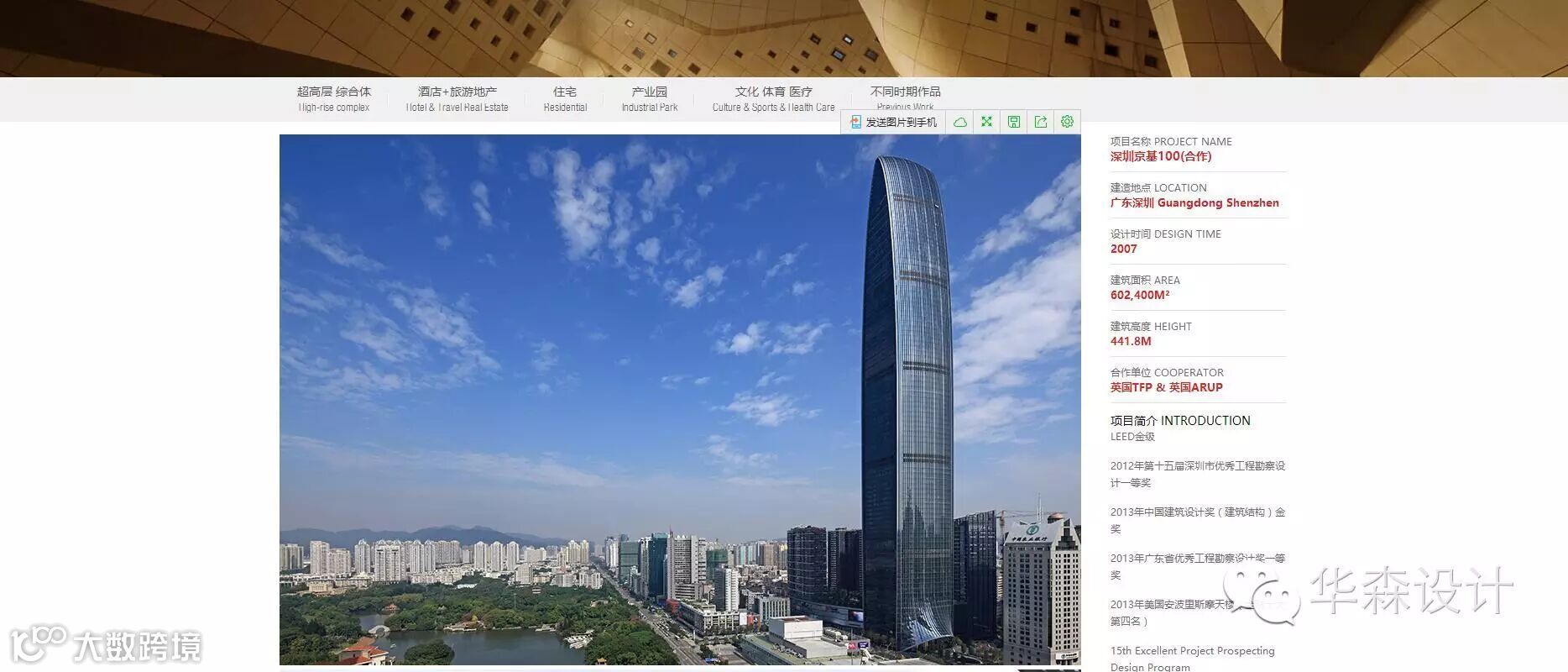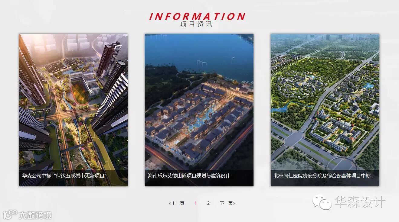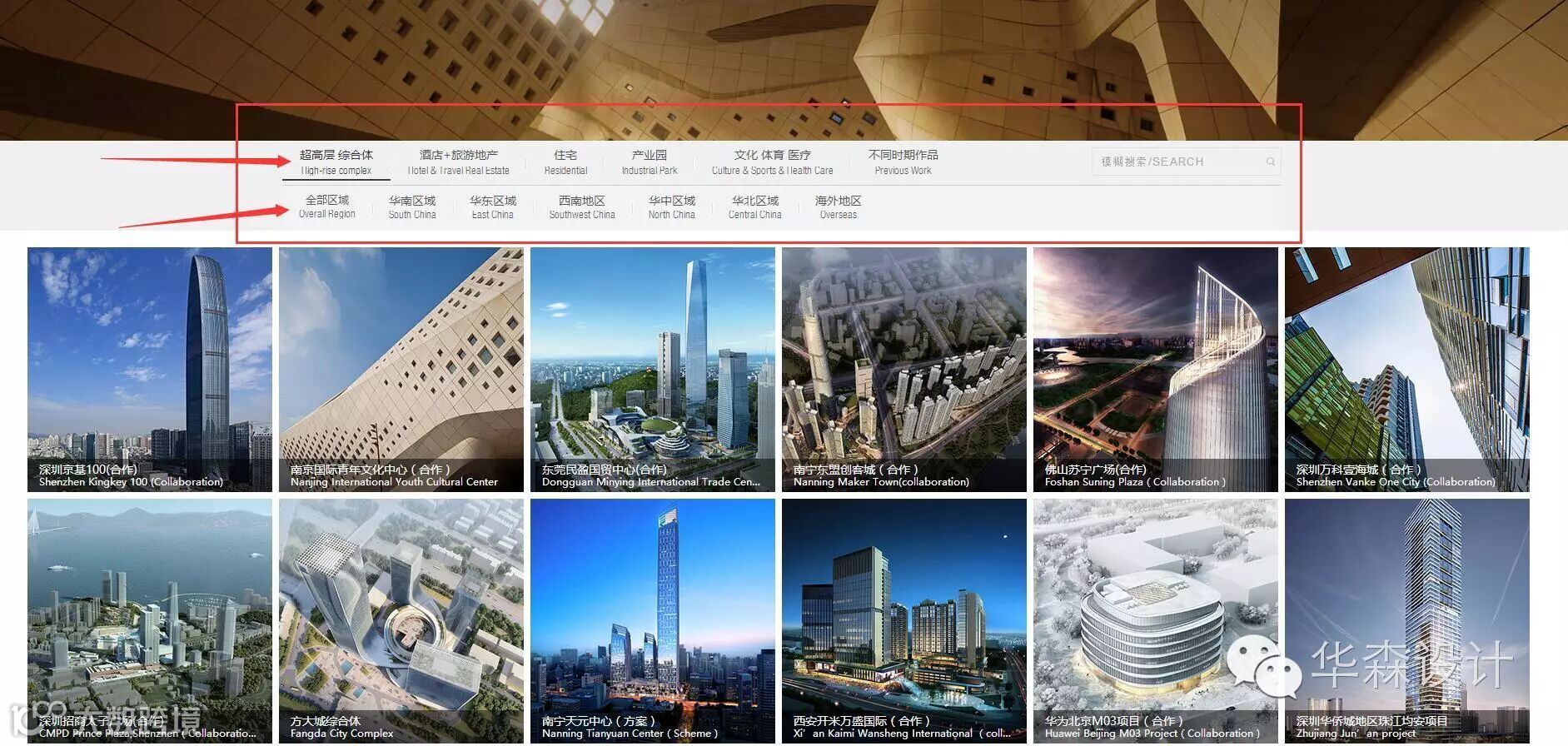 点击进入建筑设计项目页面,可见华森公司设计项目列表,首先按功能类型划分,也可按所属区域搜索: