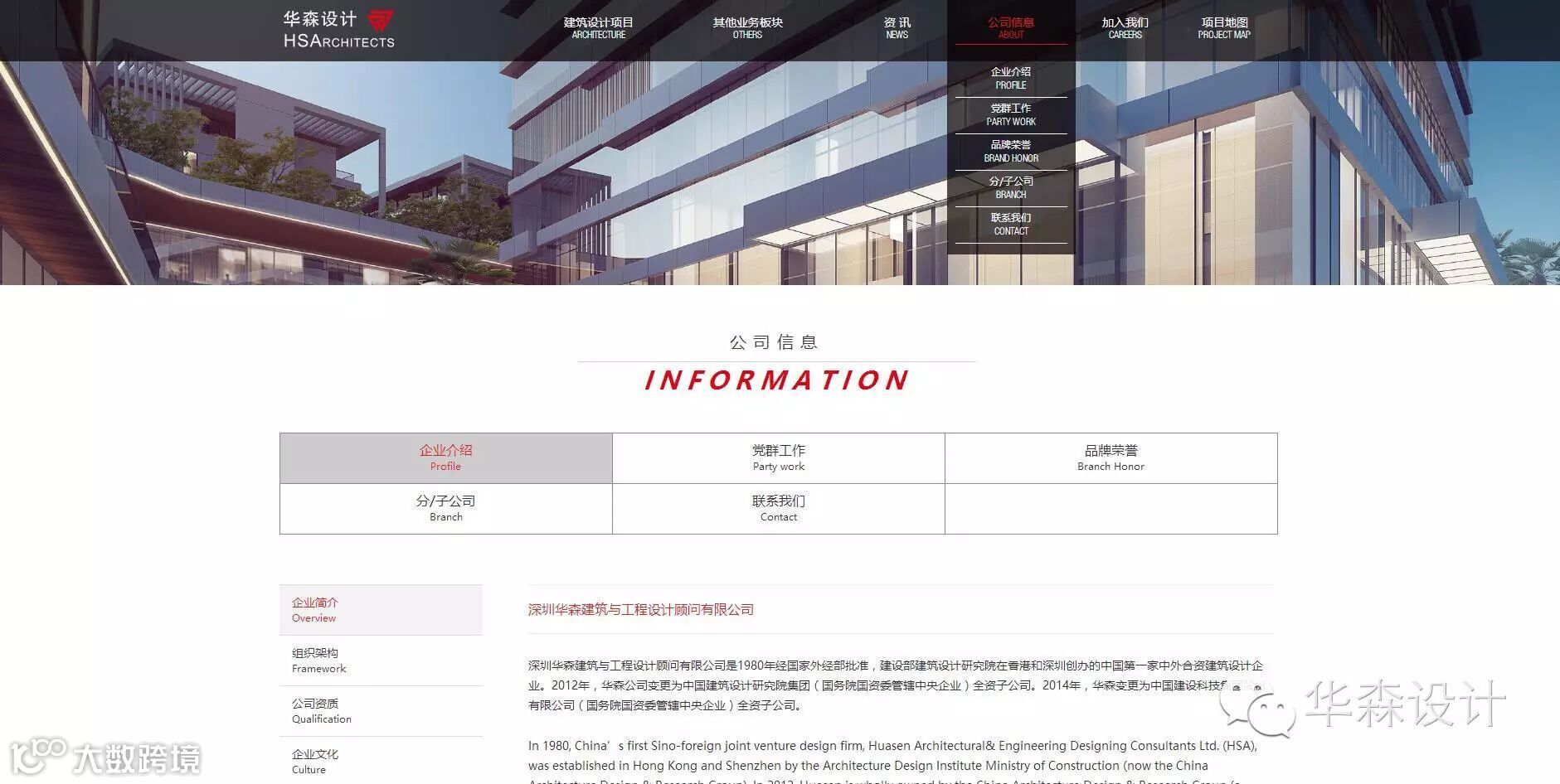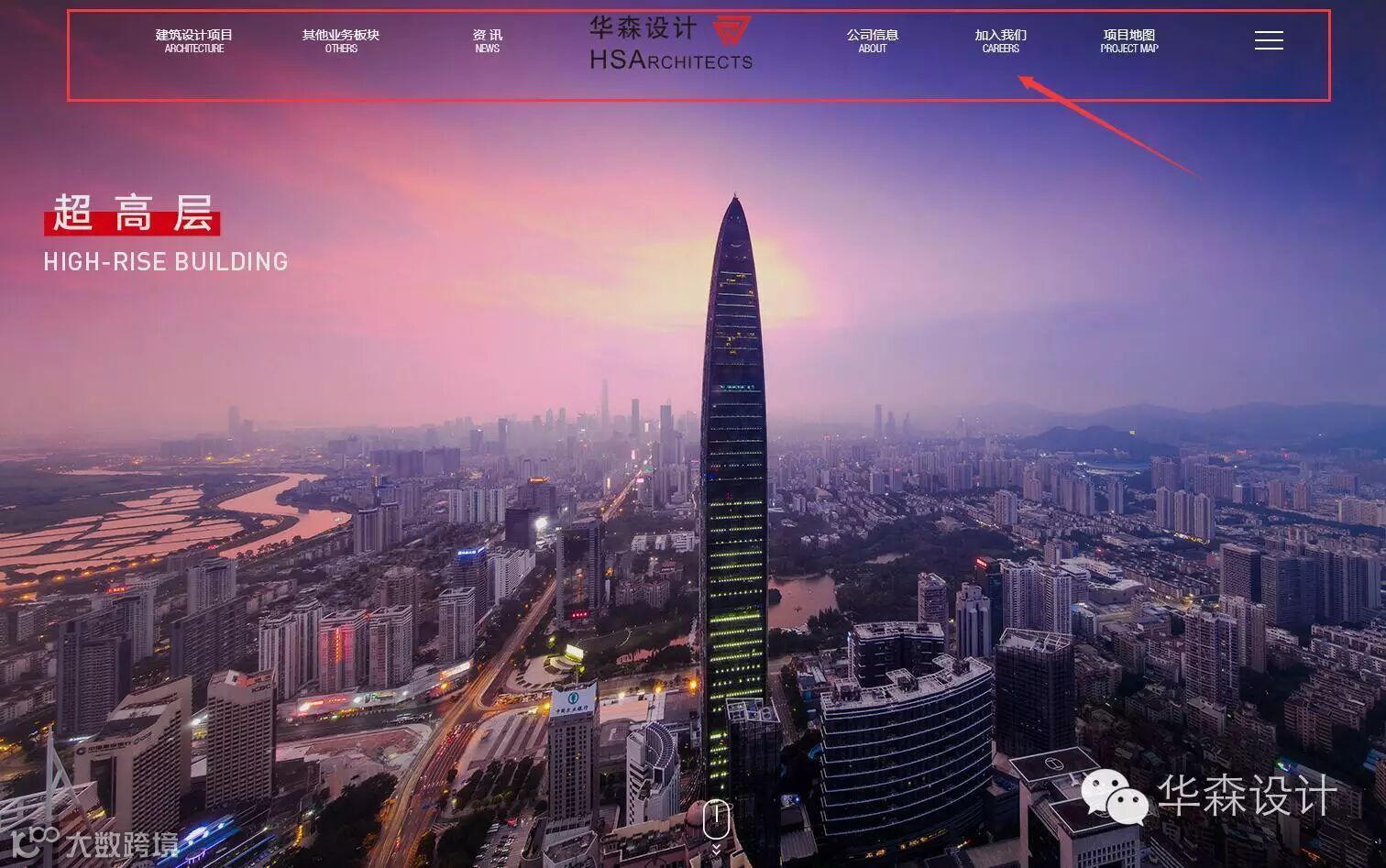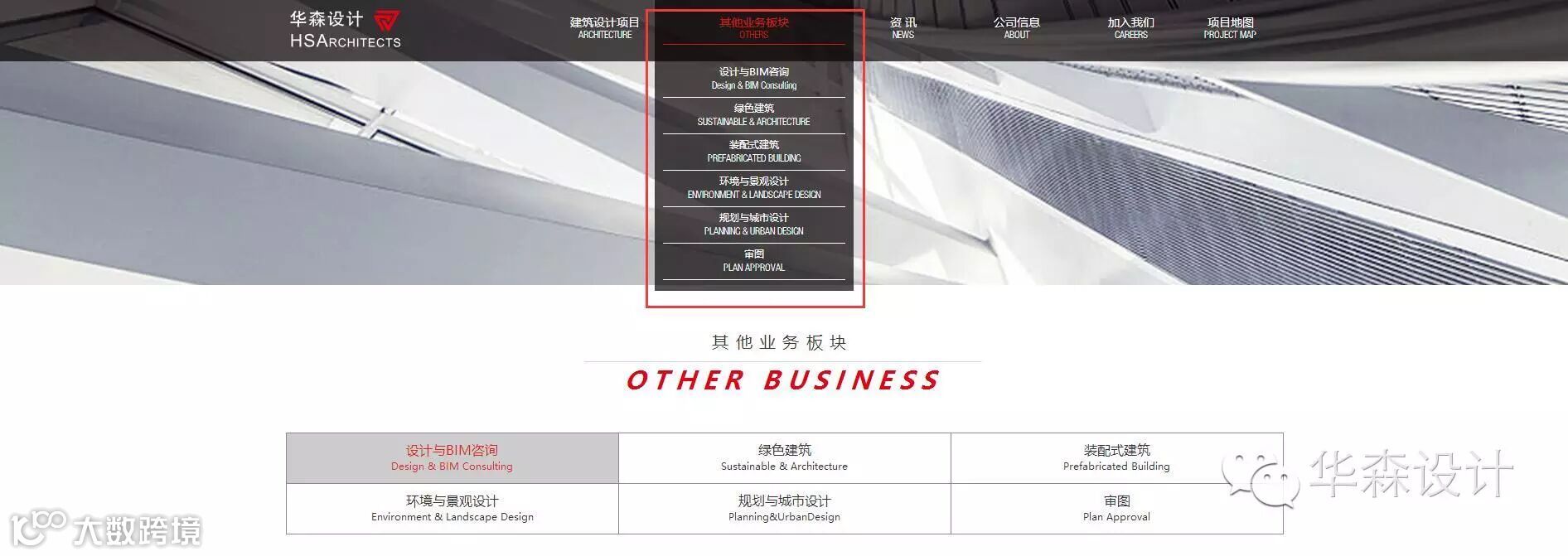 鼠标停靠在页面顶部时,即会出现导航栏六个主要栏目:建筑设计板块、其他业务板块、资讯、公司信息、加入我们、项目地图。
