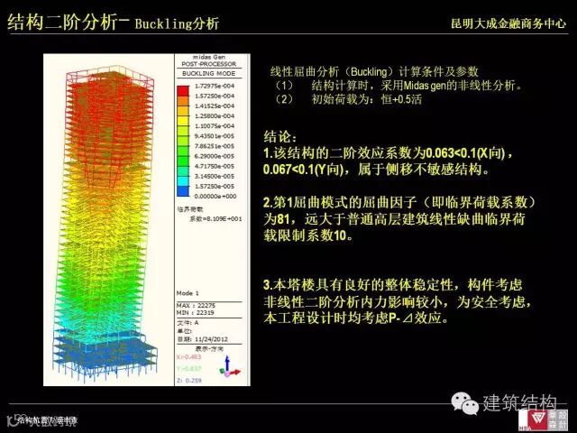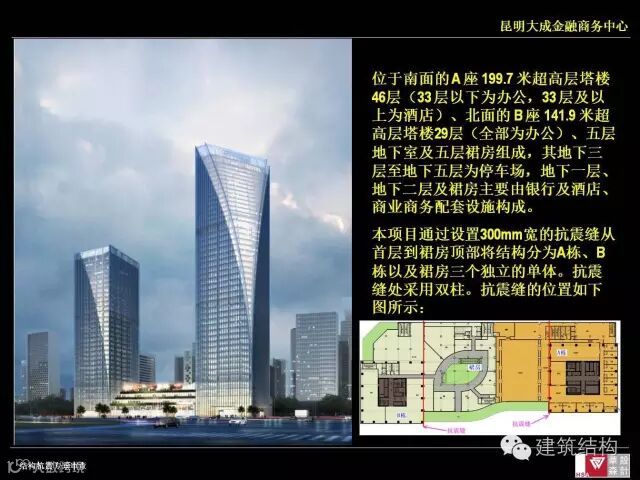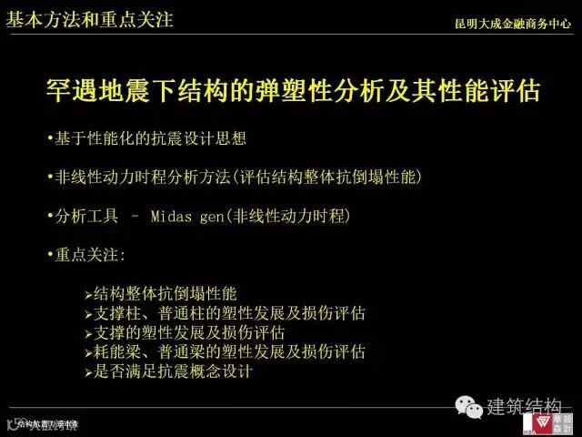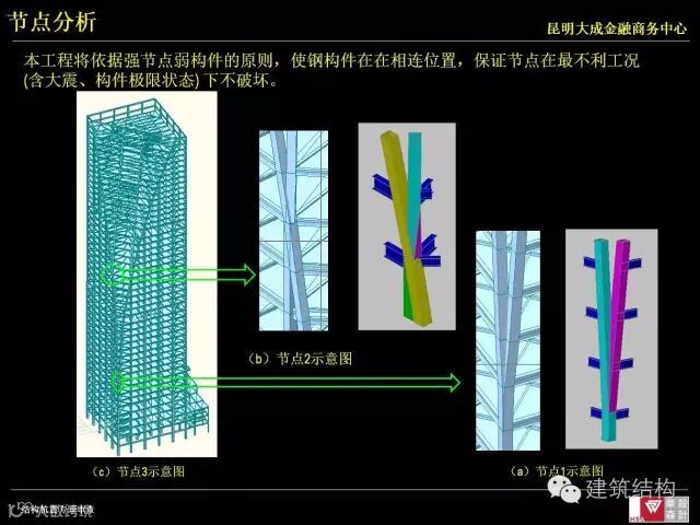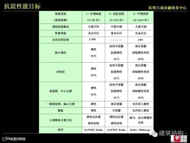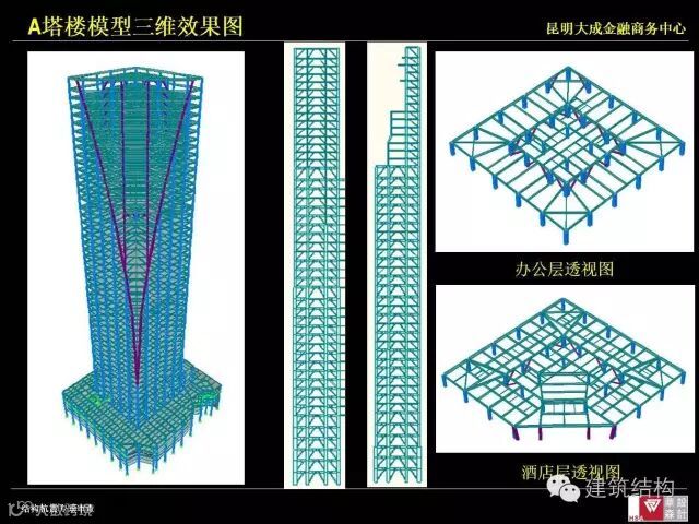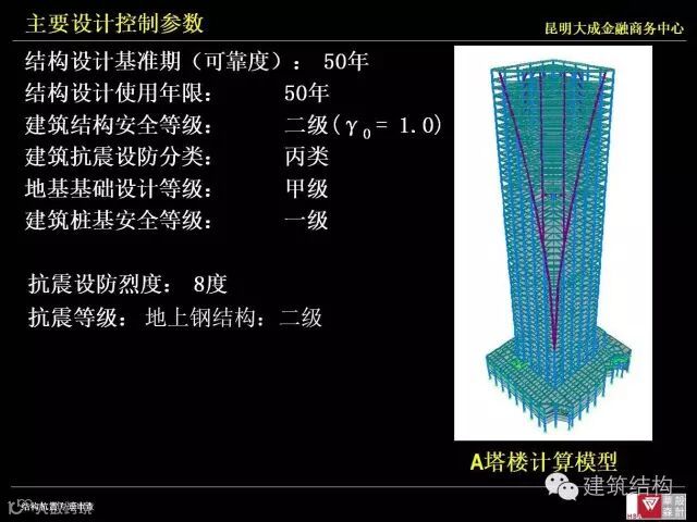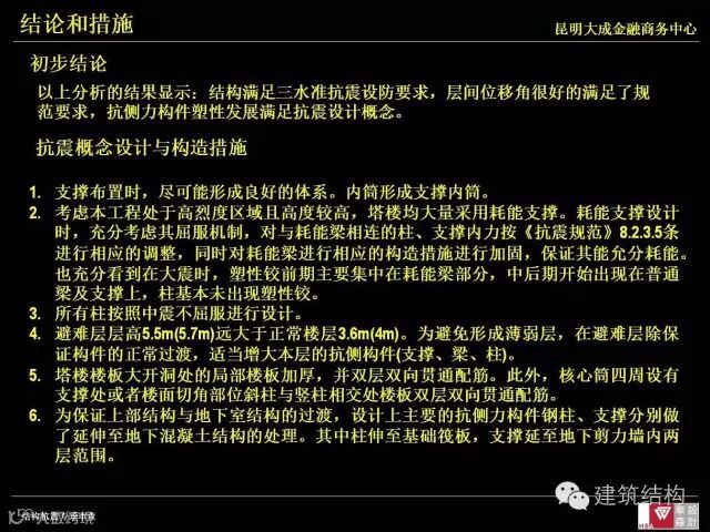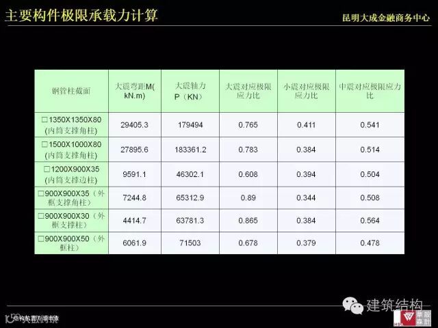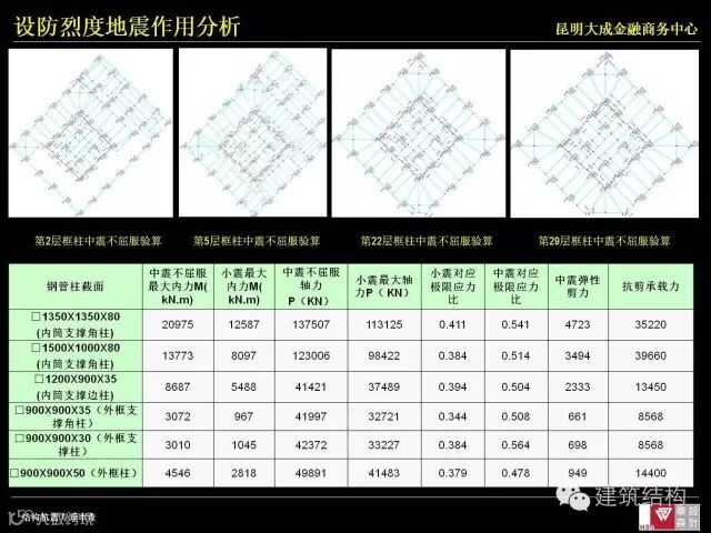 昆明大成金融商务中心位于高烈度区(8度),Ш类场地。A塔高度199.7m,采用钢框架(钢管混凝土柱)-钢框架偏心支撑内筒-组合楼板创新结构体系。在进行四种可选结构方案对比的基础上,选用既满足建筑使用功能,性价比又高、施工更方便和抗震性能最优越的结构方案。针对项目的超限情况提出合适的性能目标、符合抗震设计概念的屈曲顺序和耗能机制,然后逐一进行分析和论证,针对结构的薄弱部位和薄弱构件采取了相应的加强措施。针对创新结构体系的特点,确定合适的层间位移角控制指标,还专门进行了整体稳定性分析。主体结构抗震性能优越,其具体的论证方法及设计思路可供类似工程参考。