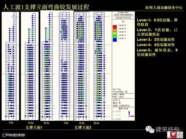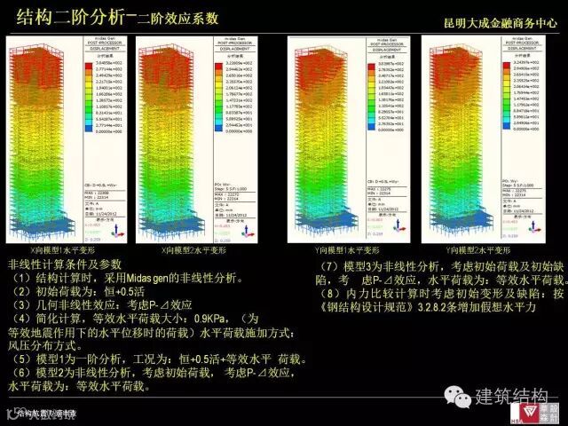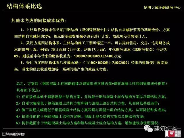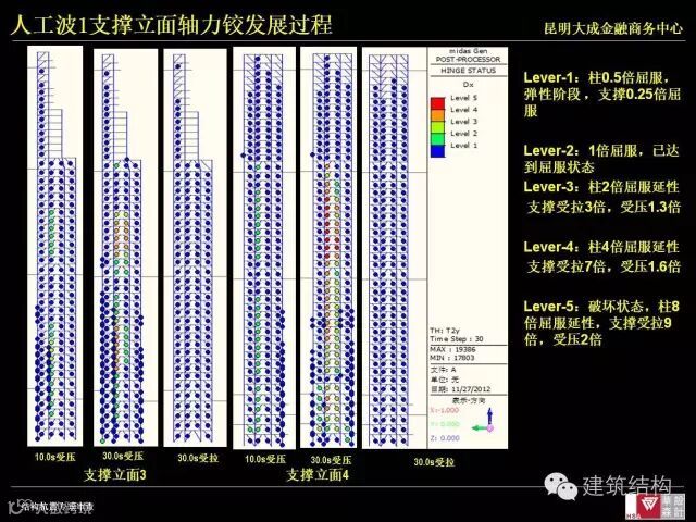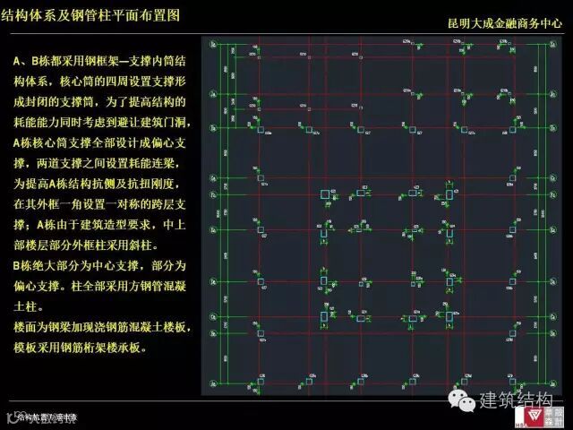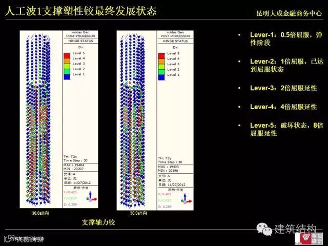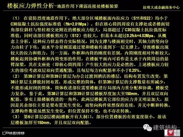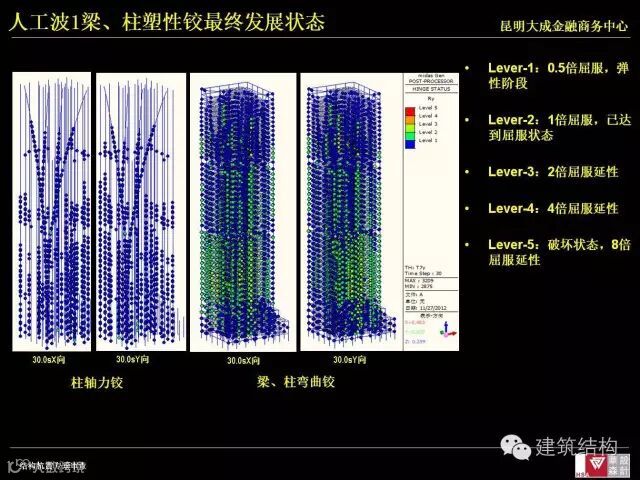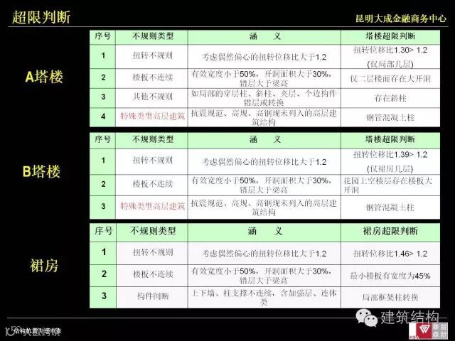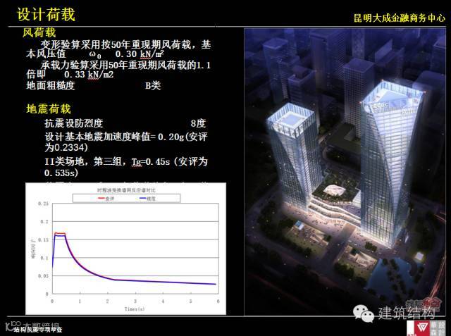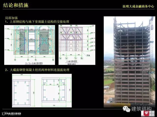 昆明大成金融商务中心位于高烈度区(8度),Ш类场地。A塔高度199.7m,采用钢框架(钢管混凝土柱)-钢框架偏心支撑内筒-组合楼板创新结构体系。在进行四种可选结构方案对比的基础上,选用既满足建筑使用功能,性价比又高、施工更方便和抗震性能最优越的结构方案。针对项目的超限情况提出合适的性能目标、符合抗震设计概念的屈曲顺序和耗能机制,然后逐一进行分析和论证,针对结构的薄弱部位和薄弱构件采取了相应的加强措施。针对创新结构体系的特点,确定合适的层间位移角控制指标,还专门进行了整体稳定性分析。主体结构抗震性能优越,其具体的论证方法及设计思路可供类似工程参考。