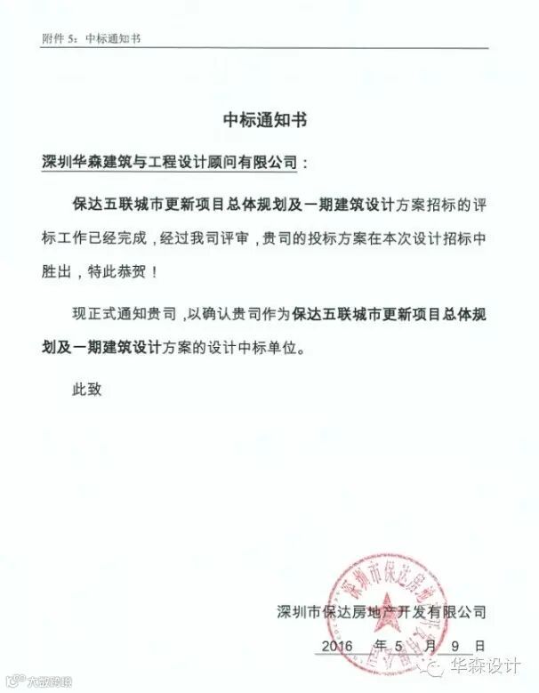 在深圳市保达房地产开发有限公司组织的“保达五联城市更新项目总体规划及一期建筑设计”投标中,经甲方评审,最终确定华森公司为中标单位。