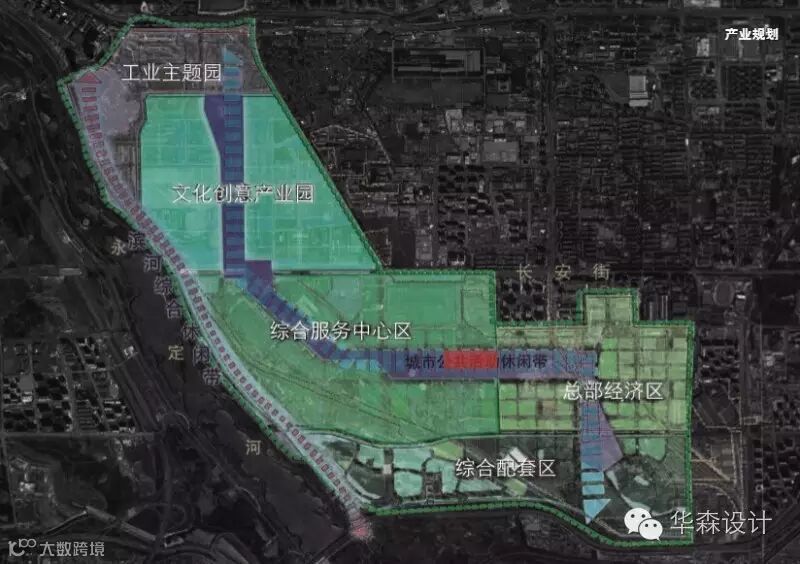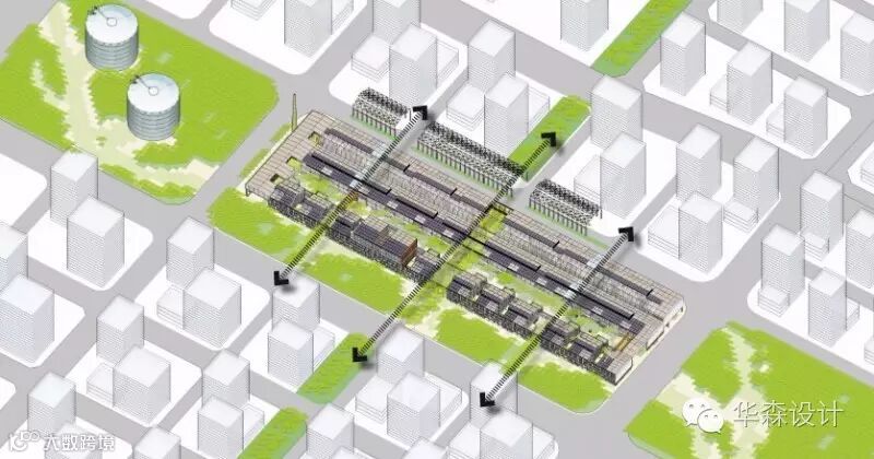 在新首钢的整体规划中,北侧是遗产区,以保留改造为主,南侧为服务与办公区,以新建建筑为主。而其中涉及更新的二型材老厂房则位于南北区中间的园区绿化带上。