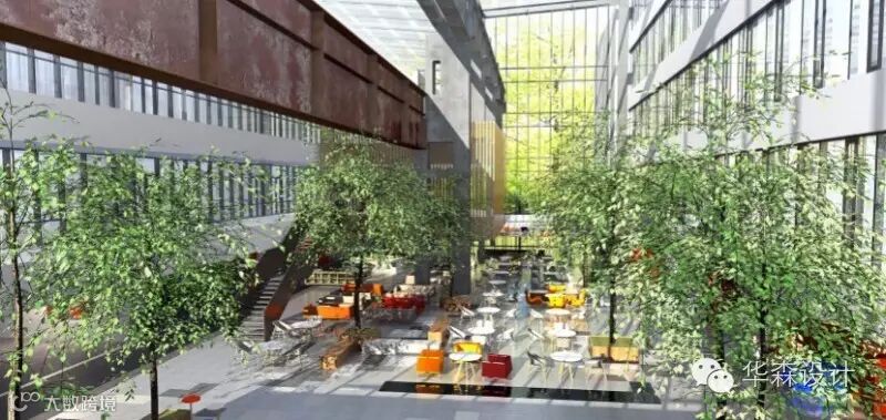 两种办公空间中间,是一个线性城市开放公园,里面有湿地区、有工业遗产区(大量保留机床、吊机等设备),希望将来能够将更多的首钢的记忆留存在这个公园里面。西侧则设置了可向城市开放的多功能厅、展厅等功能。