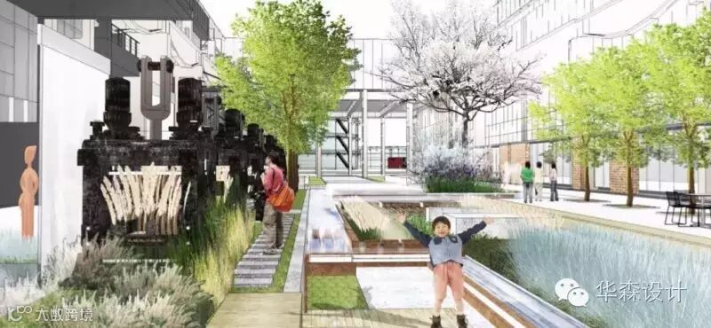 保留的设备多数集中在景观公园内,利用生产线记忆这一线索,景观部分结合保留设备与现场基础进行了深入细致的设计。