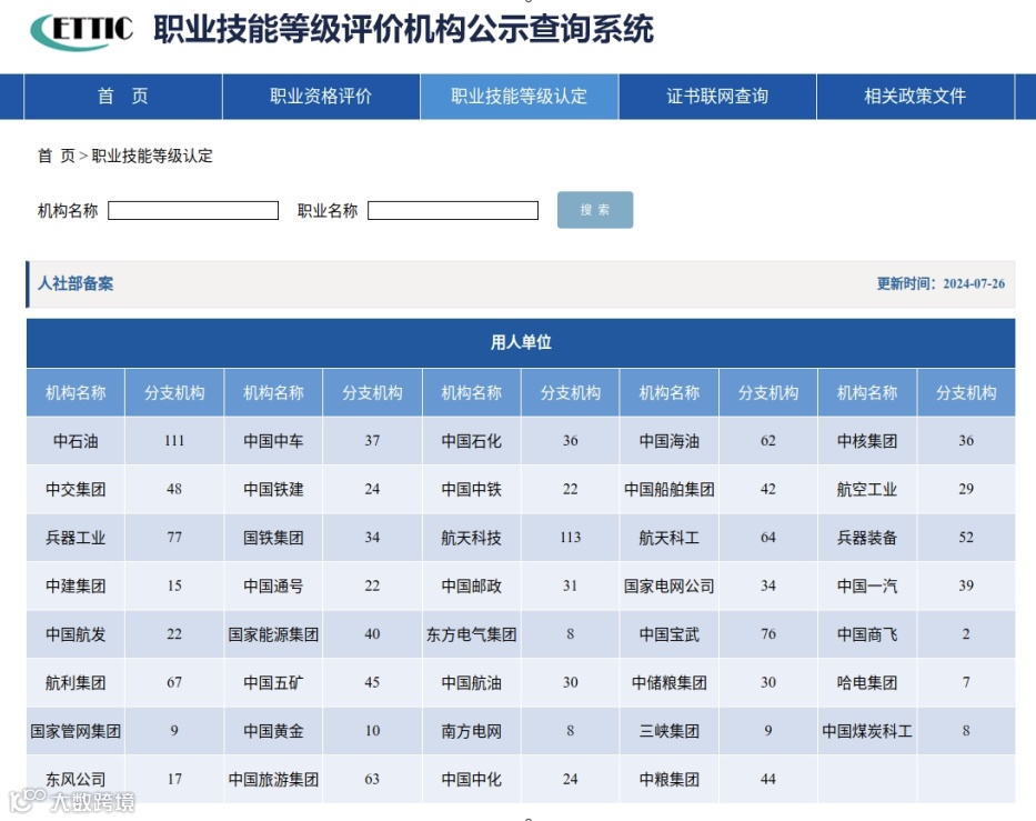 提供职业技能等级认定机构查询