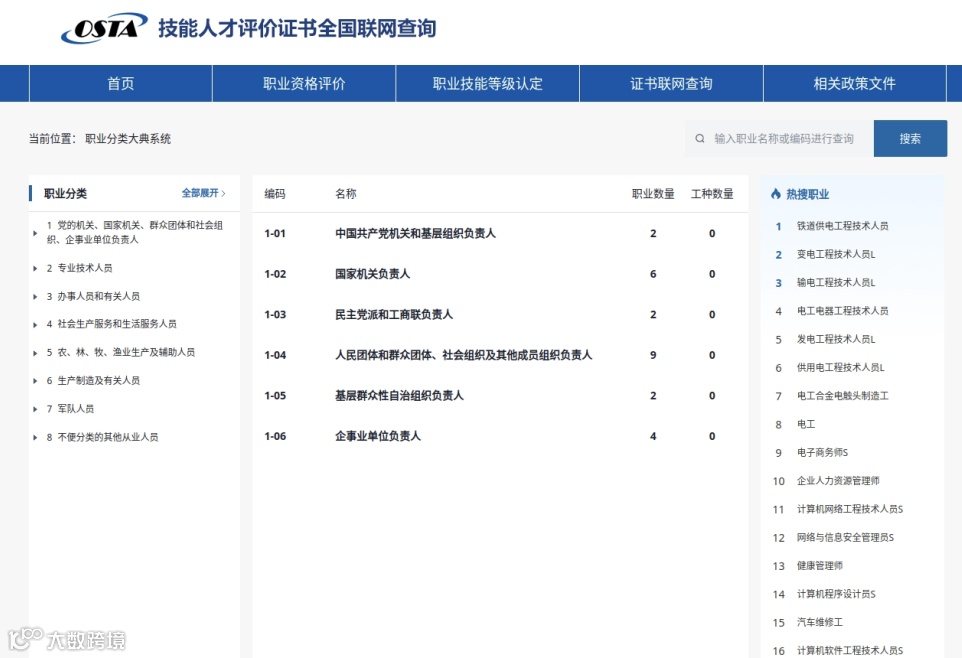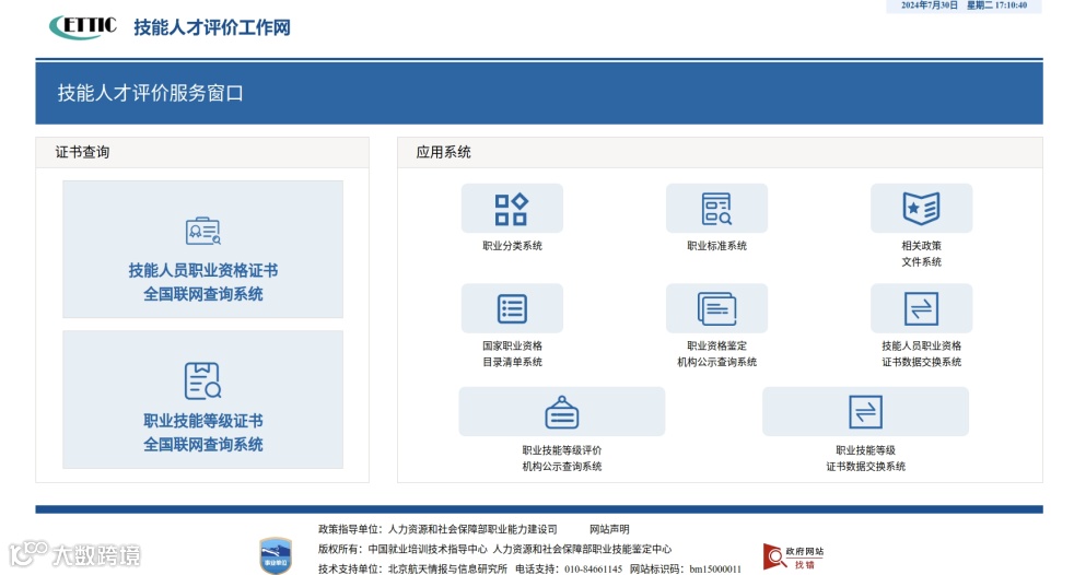 技能人才评价工作网,面向社会各界提供国家职业分类、国家职业标准、技能人才评价政策、技能人员职业资格证书和职业技能等级证书、国家职业资格目录清单、职业资格考核鉴定机构、职业技能等级认定机构等“一站式”权威查询服务。该网站是人力资源和社会保障部主办的官方网站。