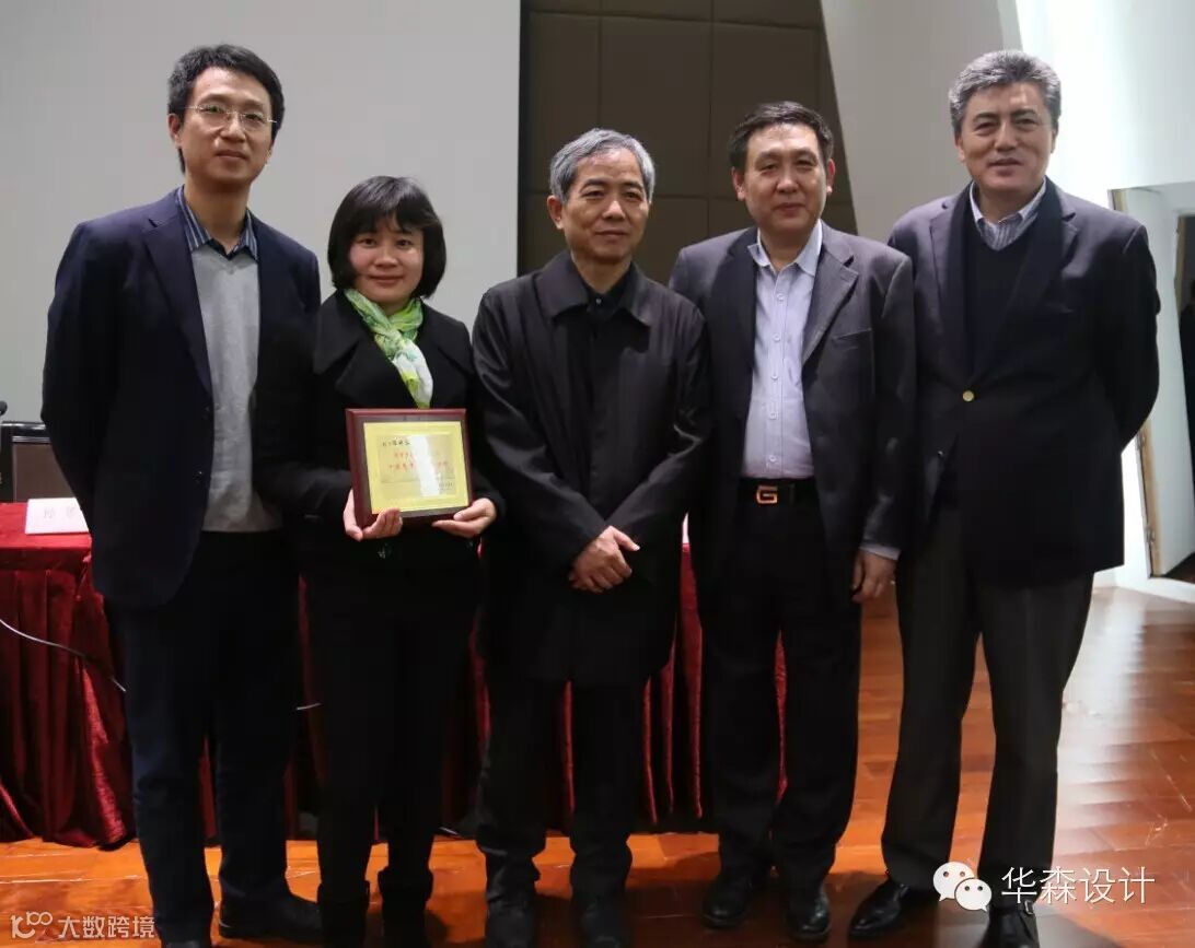 深勘协荣誉会长孟建民院士,深勘协会长、华森公司党委书记赵春山,华森公司副总经理张大明,华森咨询公司总经理唐志辉与十佳青年景观设计师陈妍容合影