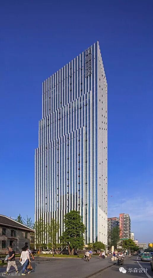 项目位于成都市核心区,用地狭小,建筑主体通过退台的处理方式,巧妙地应对了成都市规划技术管理规定中对不同边界条件和建筑高度的退线要求,最大化地利用了有效空间,并形成对周边城市环境友好的姿态。立面用统一的建筑语言和细部构成简洁有力的城市空间形象。