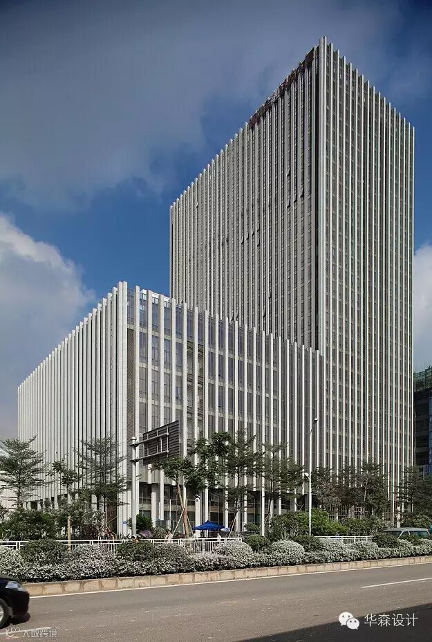 作为OCT华侨城的新地标,本案建筑形象素以简洁大气的立面设计风格,在造型新颖别致的基调上,力求使立面语言融合在深圳特有的现代城市语境与华侨城创新艺术的氛围之中。本案近250 米的超高层塔楼体量及其多层裙房均以水平横向线条为立面昭示,在刻绘轻盈感观的同时又不失稳重。为丰富立面设计的材料语言,本案横向线条通过易于塑性的铝板组合的视觉厚度与水平位置的差异,构成富有层次的进退阴影关系;铝板的实与玻璃的虚产生微妙的虚实关系。绿色生态设计也视为本案立面设计的重点之一:通过设置空中的公共绿化休闲空间、屋顶花园,每层凸出的被铝板包裹条形花池等设计手段,实现本案绿色的“天空之城”概念初衷。