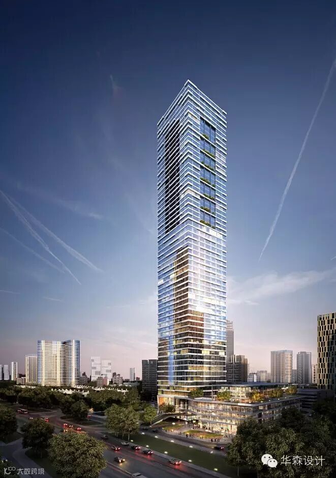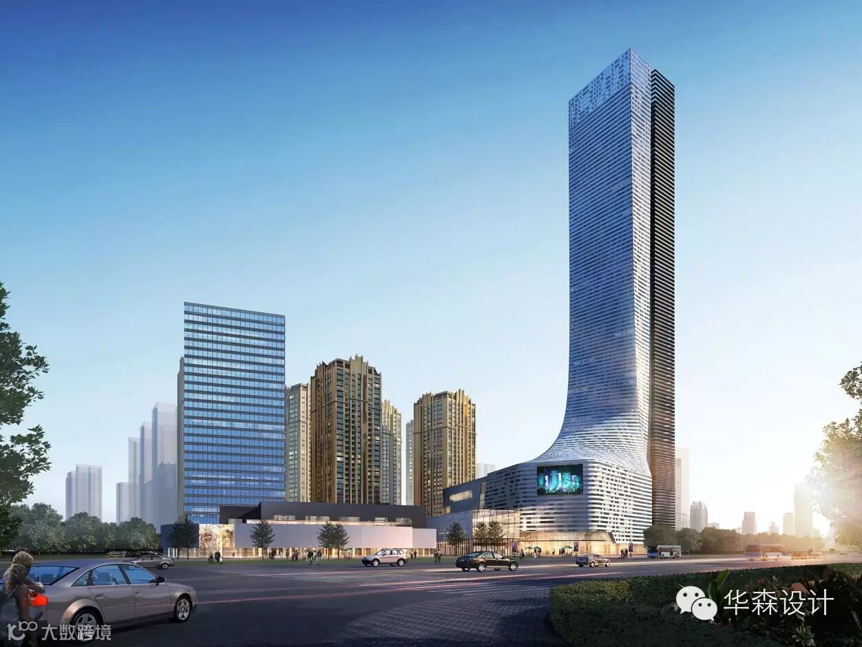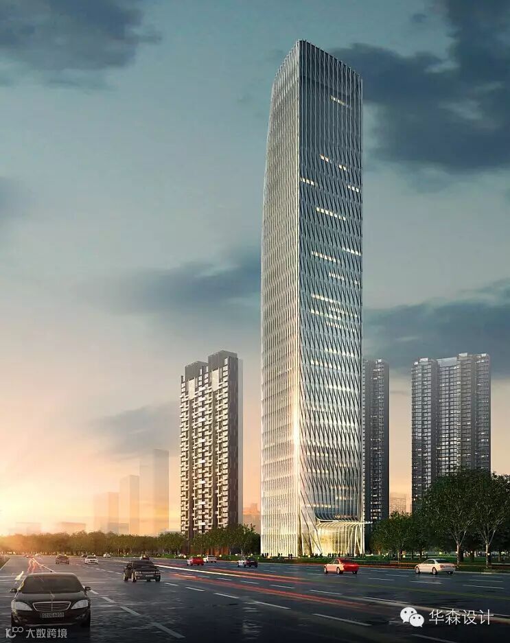 项目地块包含一栋170米办公塔楼、一栋100米公寓、6栋100米住宅塔楼。170米高办公塔楼为整个项目的视觉焦点。立面上采用了双曲线旋转向上的造型,形成具有张力的塔楼形象。两种不同颜色的玻璃在立面上一分为二,更显建筑挺拔。集中商业主要采用简洁利落的现代建筑风格。流线型舒展的建筑立面,力求打造宜居、舒适的氛围。石材、金属、木百叶的设置与玻璃幕墙的运用相得益彰,更体现整个项目的活力与动感。