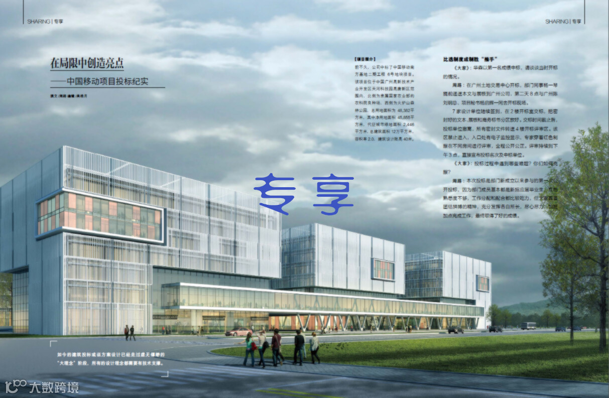 中国移动南方基地二期工程6号地块项目,位于中国广州高新技术产业开发区天河科技园高唐新区范围内,项目北侧为隶属国家农业部的农科院良种场,西侧为火炉山森林公园,总用地面积为48382平方米,其中净用地面积45855平方米,代征城市绿地面积2446平方米,总建筑面积12万平方米,容积率2.0,建筑设计限高40米。