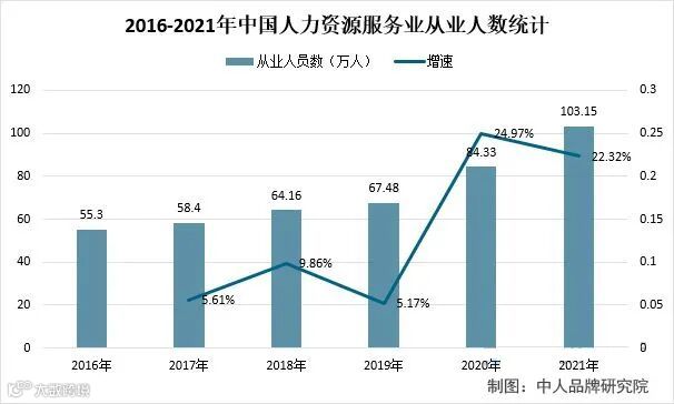 从人力资源服务业从业人数看,2016-2021年,中国人力资源服务业从业人数呈现增涨趋势。2021年中国人力资源服务业从业人数万103.15万人,同比2020年增涨22.32%。