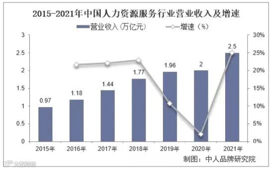 2015年我国人力资源服务行业营业收入(宽口径)仅0.97万亿元,2021年实现总营收2.5万亿元人民币(宽口径),同比增长25%,2015-2021年CAGR为17.09%。
