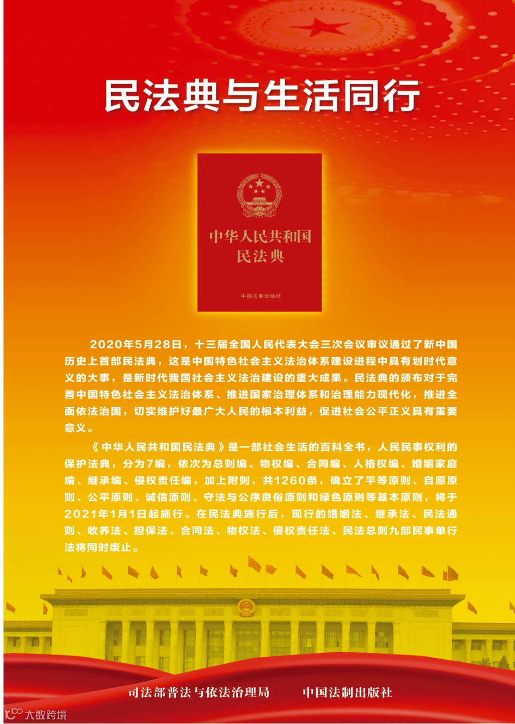 《中华人民共和国民法典》于2020年5月28日表决通过,自2021年1月1日起施行,共七编,1260条,被誉为“社会生活的百科全书”。