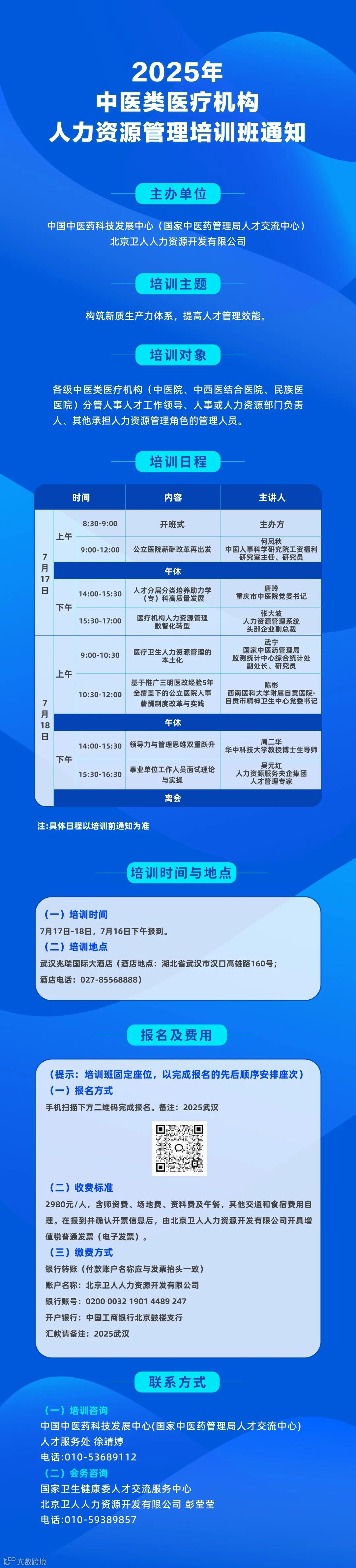 7月 武汉 | 2025年中医类医疗机构人力资源管理培训班通知